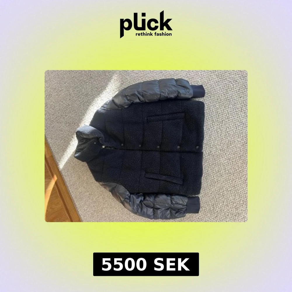 Svart jacka från Moncler med teddyfleece på kroppen och glansiga pufferärmar. Storlek 12 years/152. Inköpt på NK i januari 2025 nypris 8299 (kvitto finns).