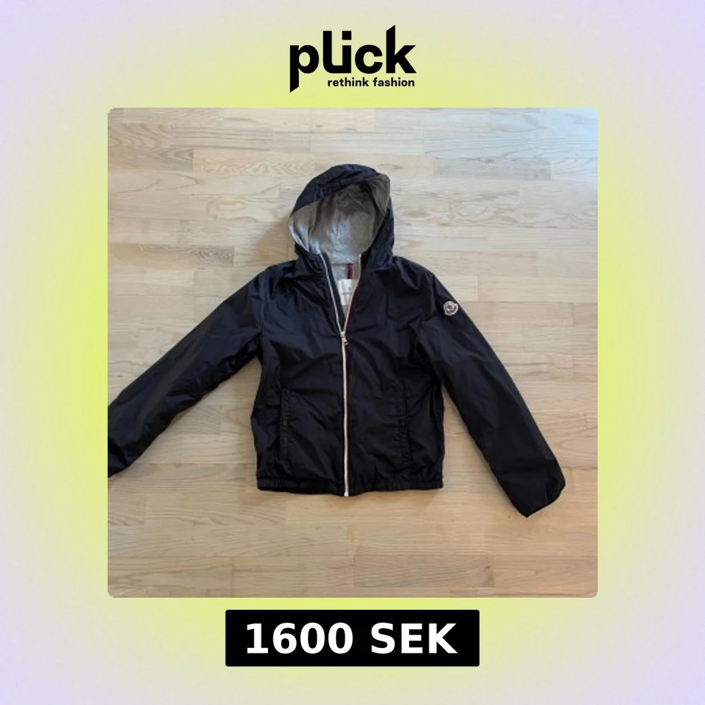 Snygg mörkblå vindjacka från Moncler med huva och vit dragkedja. Jackan har Moncler-logga på ärmen och grått innerfoder. Strl 14A =strl 164. Nypris ca 5000kr