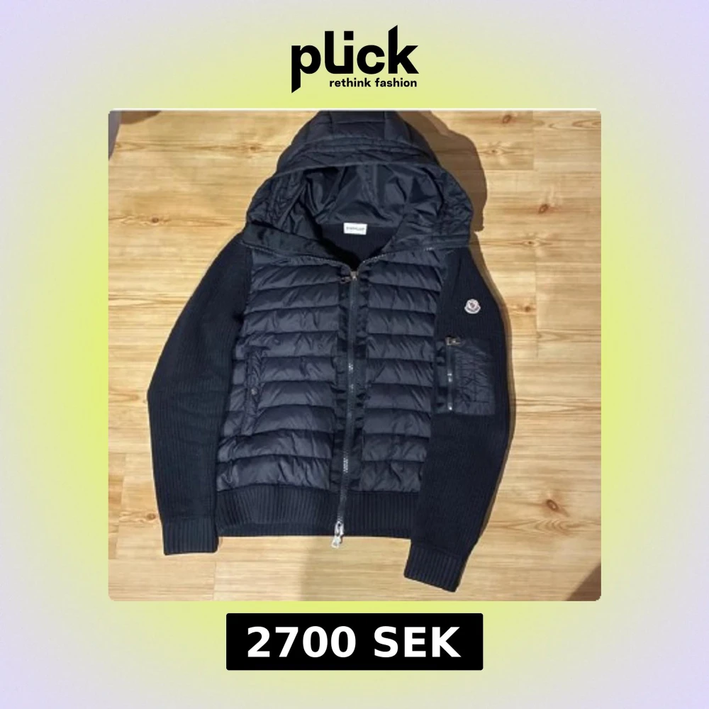 Snygg svart pufferjacka från Moncler med huva och dragkedja. Jackan har en quiltad design på framsidan och ribbade ärmar. Perfekt för kyligare dagar. Köpt för 8000