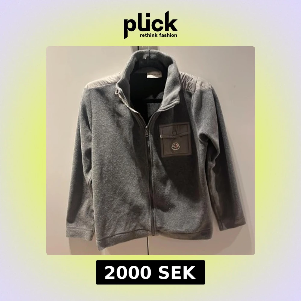 Säljer en grå fleecejacka från Moncler med dragkedja och en liten bröstficka med logotyp. Jackan har långa ärmar och en hög krage. Perfekt för kyliga dagar och ger en stilren look.