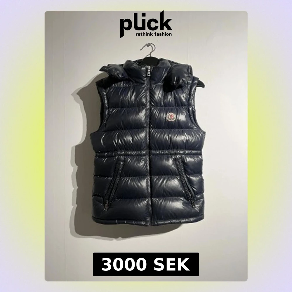 Snygg mörkblå dunväst från Moncler med glansig finish och vadderad design. Västen har huva, två framfickor med dragkedja och klassisk Moncler-logga på bröstet. Perfekt för lager-på-lager och streetstyle. Fodret har en cool serietidningsdetalj. Den passar mig som är 180cm å väger 65kg