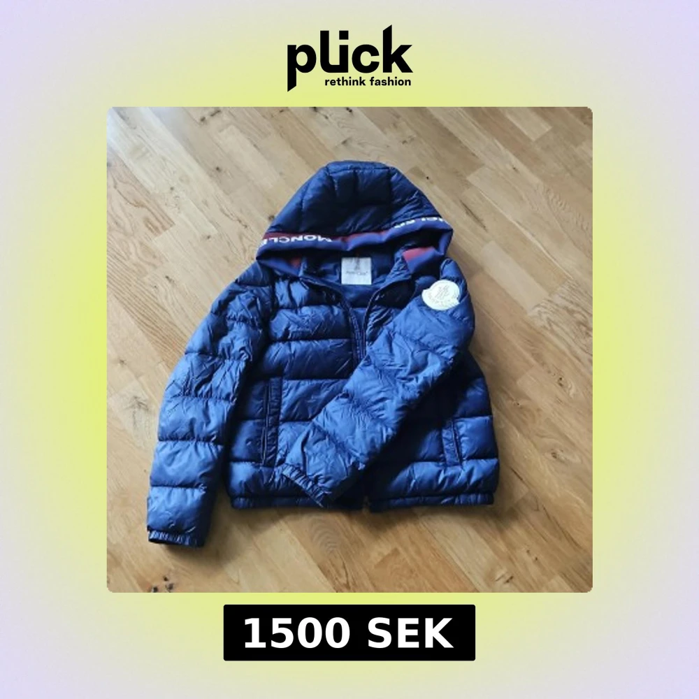 Snygg mörkblå dunjacka från Moncler med huva och logotyp på ärmen. Jackan har dragkedja framtill, quiltad design och ribbade muddar. Fodrad med dun och har en sportig look med Moncler-tryck på huvan. Perfekt för kalla dagar. En del gick sönder på inner armen men har sytts så det syns ej bild nr4.