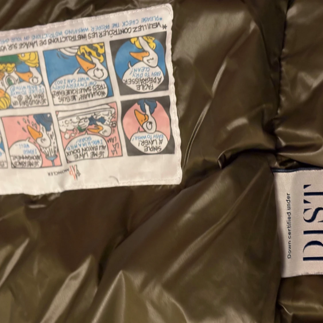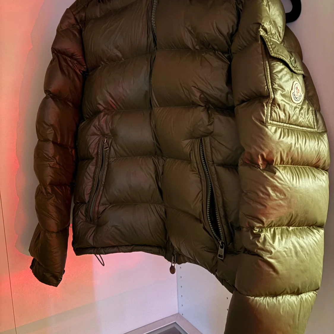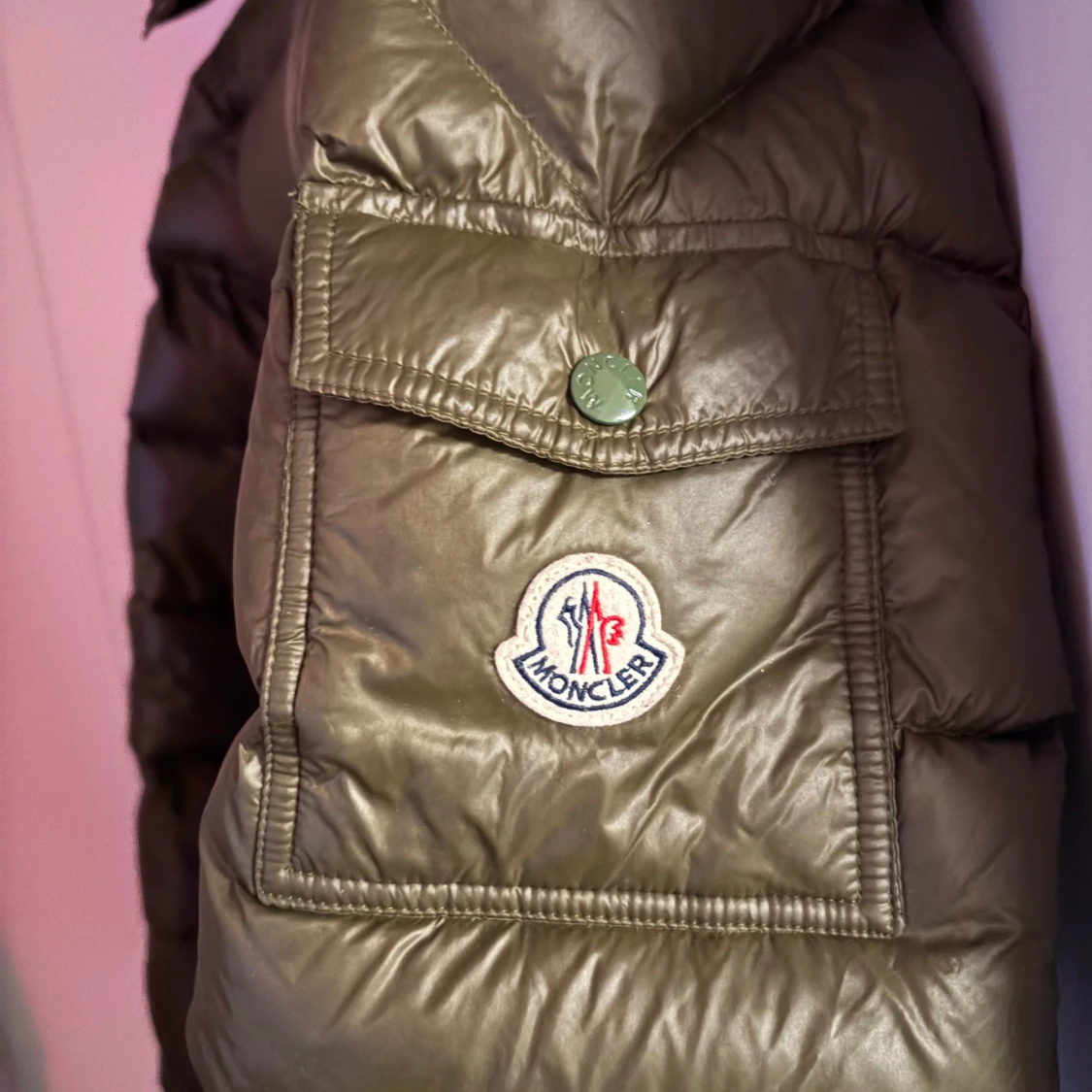Säljer en snygg olivgrön dunjacka från Moncler. Jackan har en quiltad design med en praktisk dragkedja och en ficka med knappdetalj på ärmen. Perfekt för kyliga dagar!