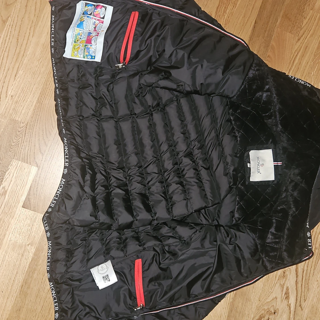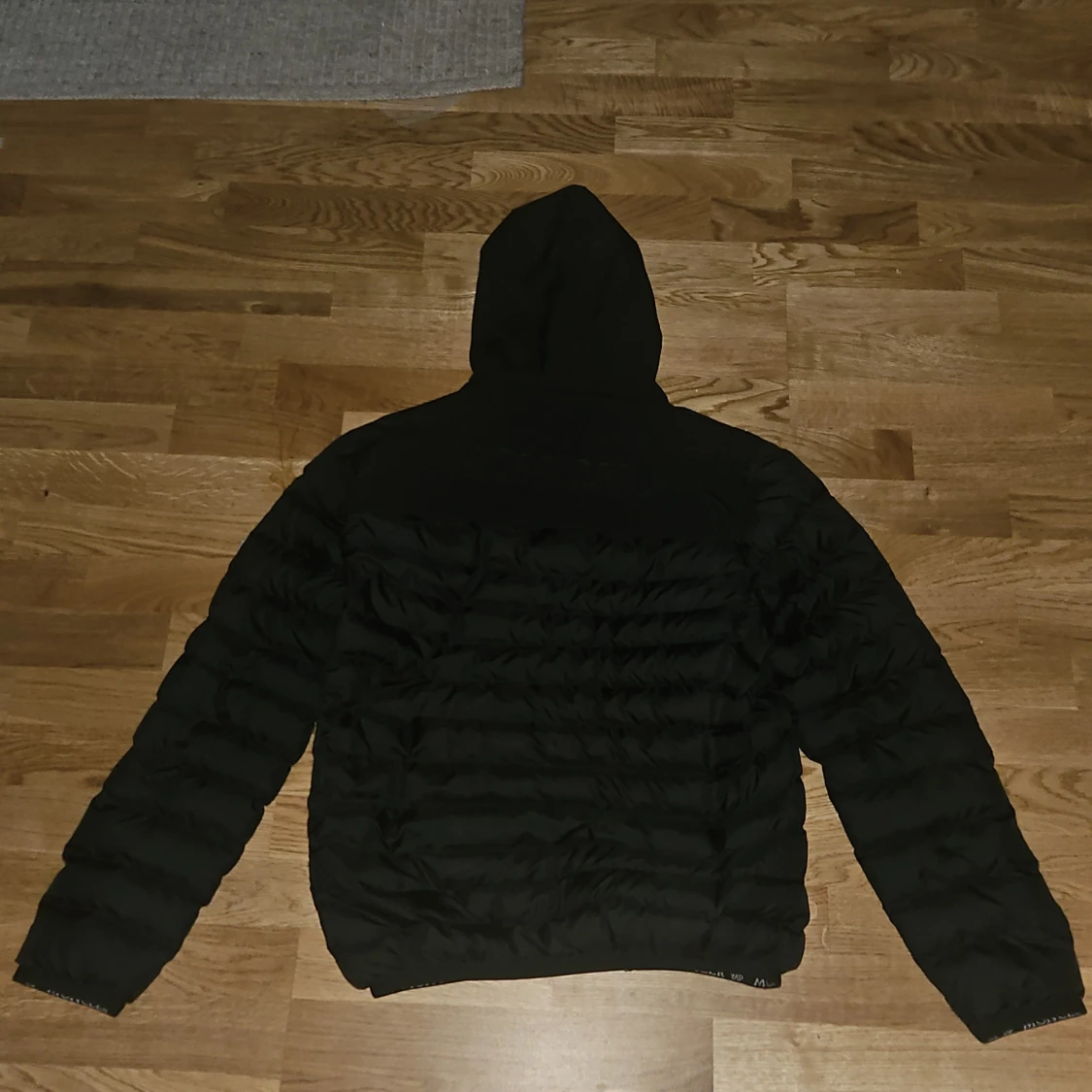 Svart pufferjacka med huva och broderad logga på ryggen. Jackan har quiltad insida, dragkedja framtill och två sidofickor med dragkedja. Elastisk nederkant med logo-tryck. Perfekt för kalla dagar och snygg streetstil. Den va för liten för mig så kan även tänka mig byta mot en annan jacka i XL. Denna är i M/L