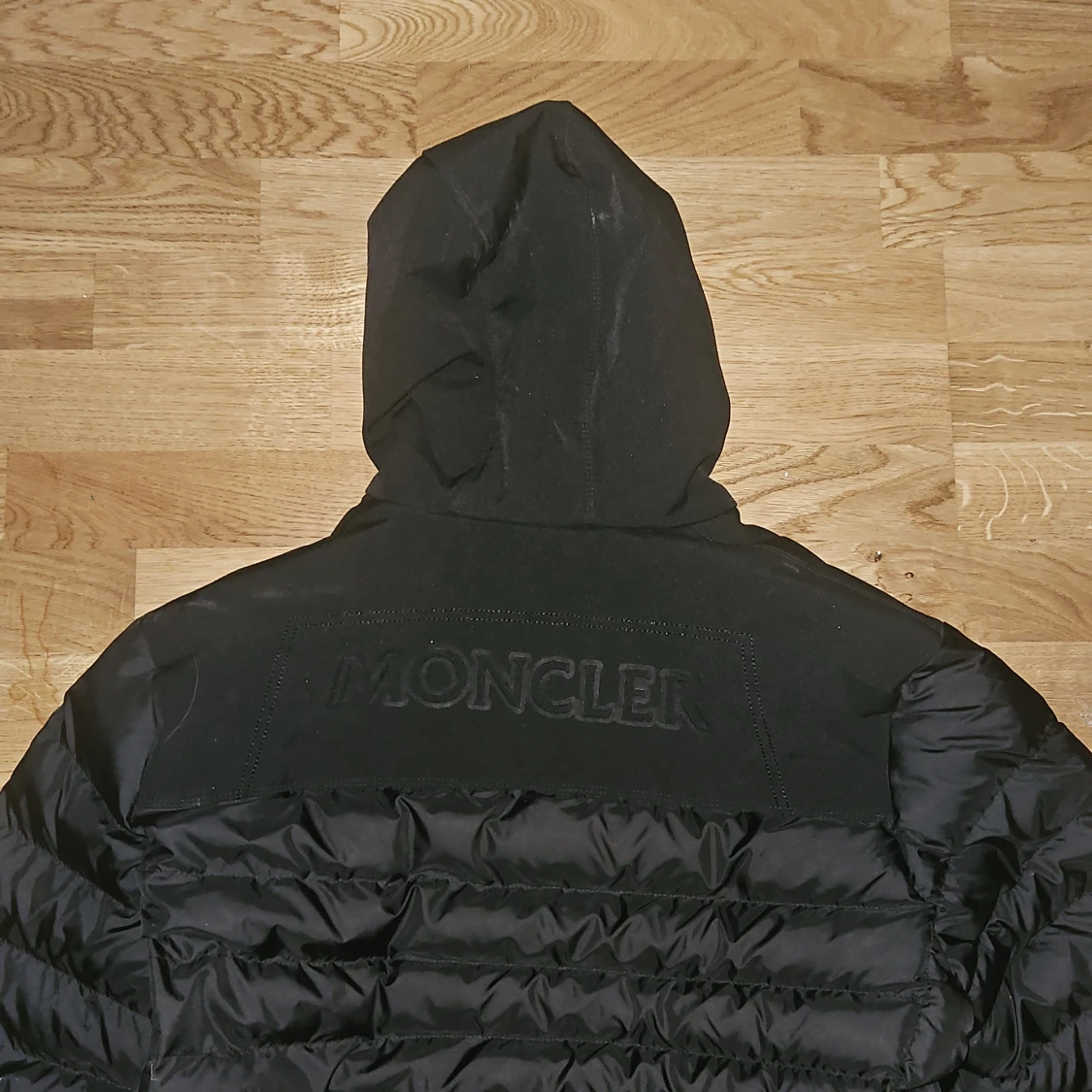 Svart pufferjacka med huva