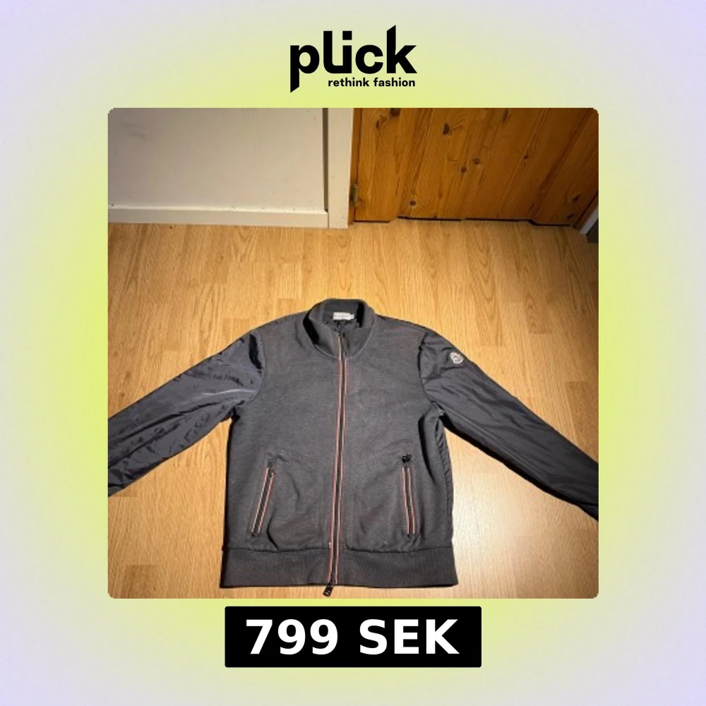 Snygg grå bomberjacka från Moncler med svarta glansiga ärmar och klassisk Moncler-logga på ena ärmen. Jackan har dragkedja framtill och på fickorna, samt ribbade muddar vid krage och nederkant. Perfekt för dig som gillar stilren och sportig look.