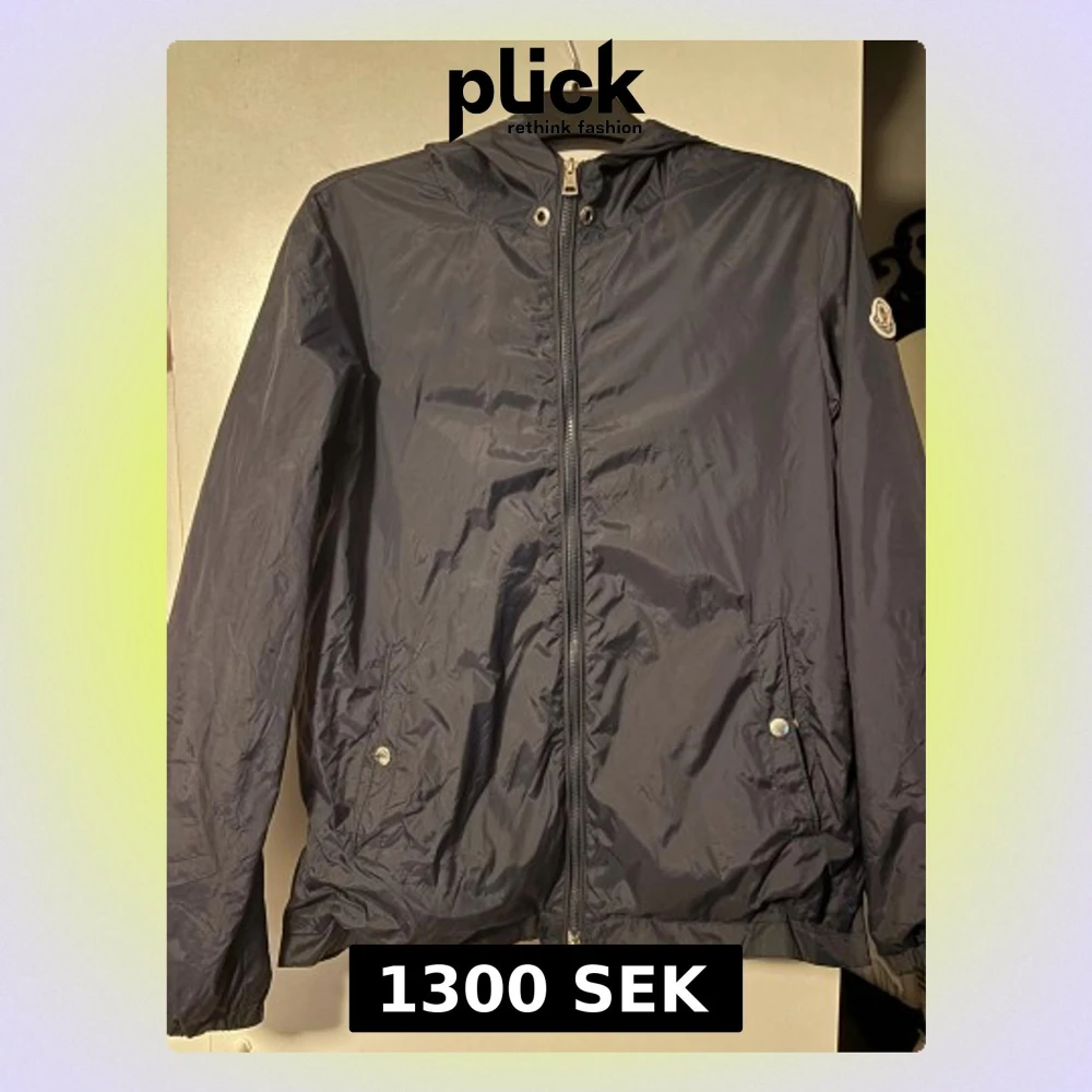 Snygg mörkblå vindjacka från Moncler med huva och dragkedja framtill. Jackan har Moncler-logga på ärmen och röda samt vita detaljer på huvan. Två fickor med tryckknappar och lätt, glansig polyesterkänsla. Perfekt för dig som vill ha en stilren och sportig look. Kan gå med i pris vid snabb affär