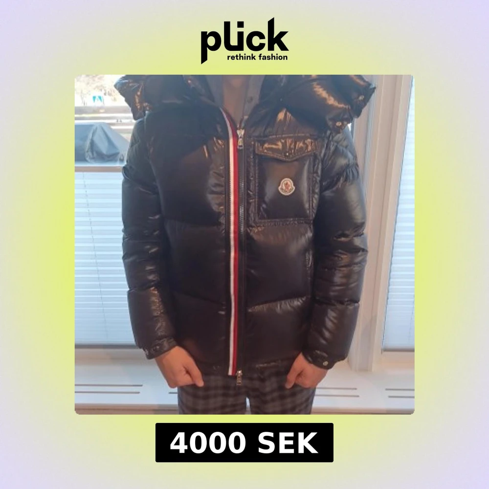 Säljer en svart, glansig dunjacka från Moncler med stor huva och klassisk logga på bröstet. Jackan har rödvit randig dragkedja, bröstficka med knapp och quiltad design. Perfekt för kalla dagar och riktigt snygg streetstil. Den är i väldigt bra skick då jag har bara använt den några gånger. Säljer den för att den är för liten