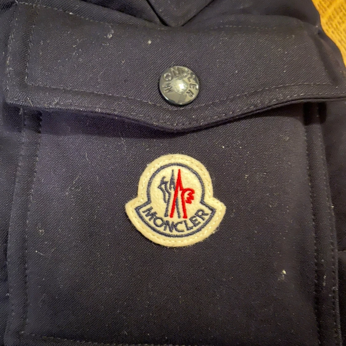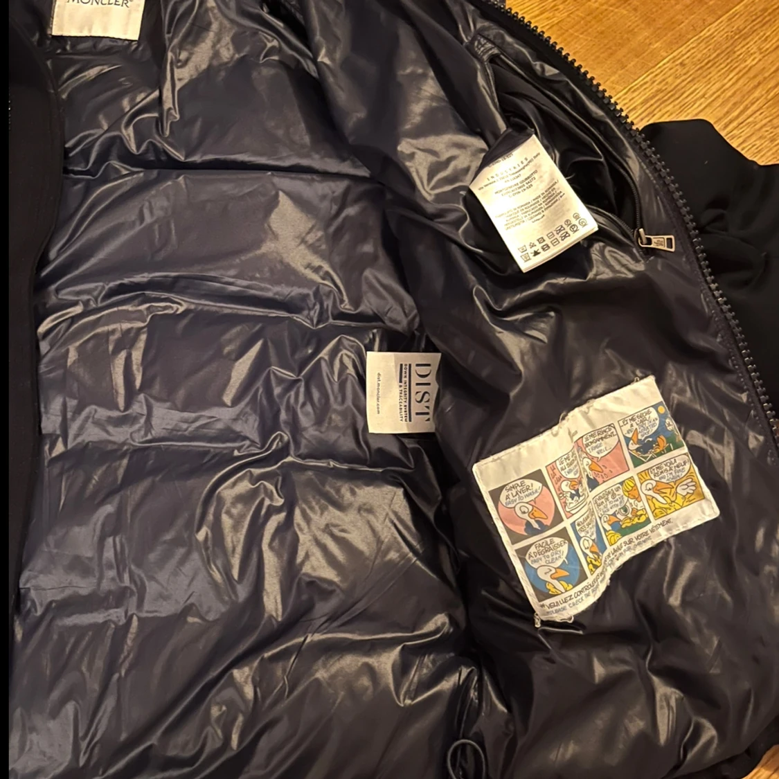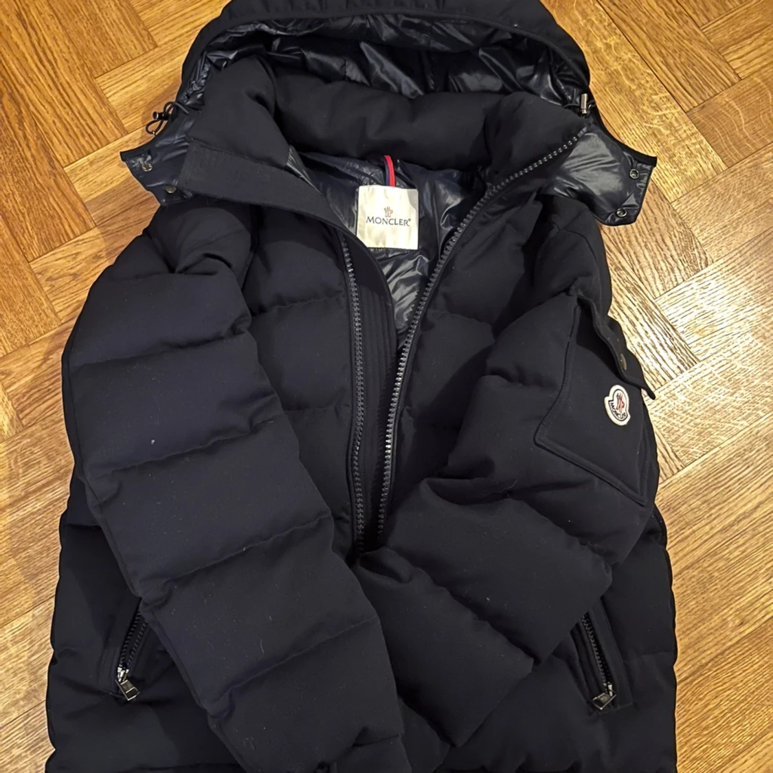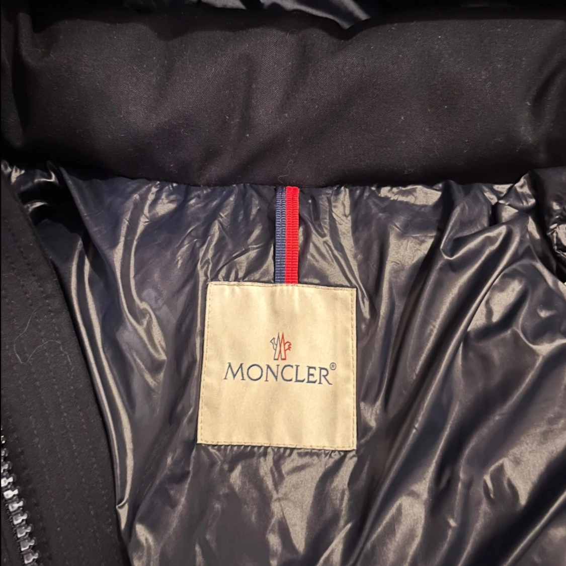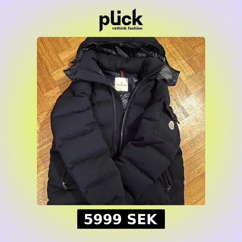 Säljer en svart dunjacka från Moncler med huva och dragkedja. Jackan har långa ärmar och två fickor med dragkedja. Perfekt för kalla dagar med sin pufferdesign. Tar emot byte