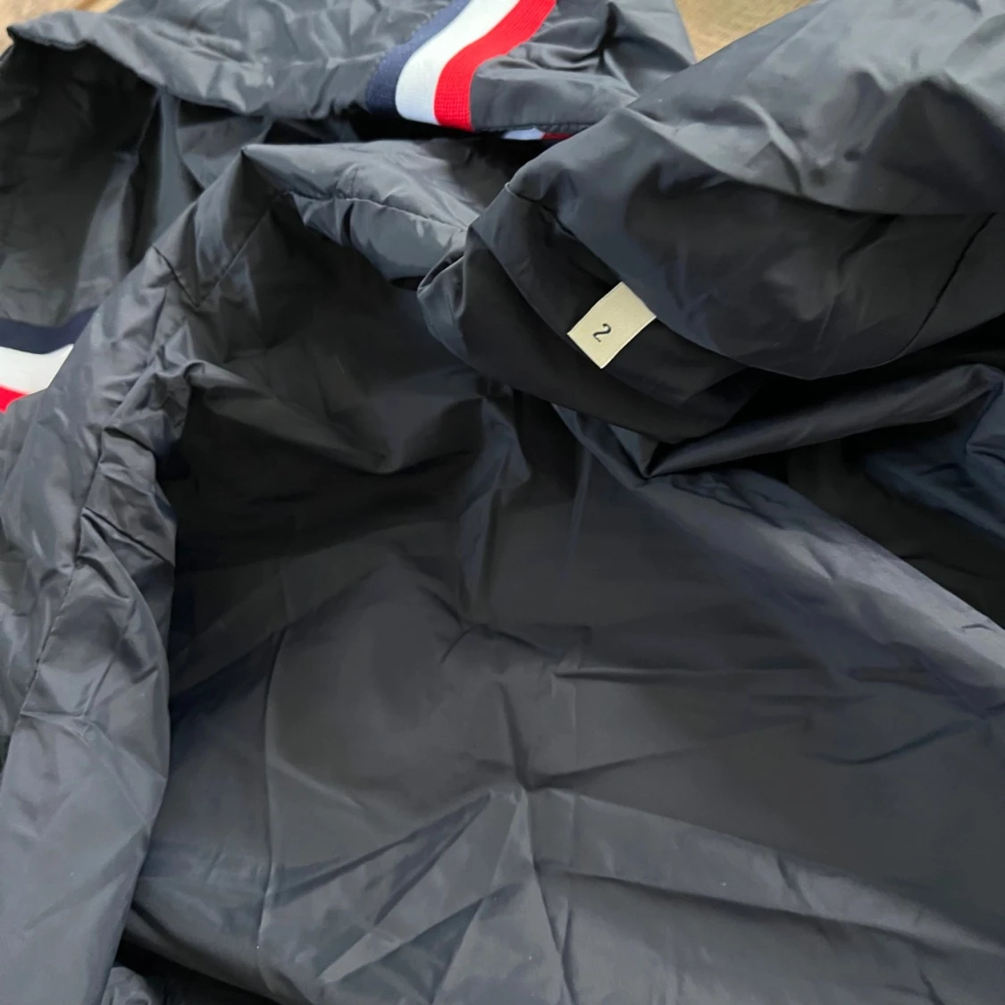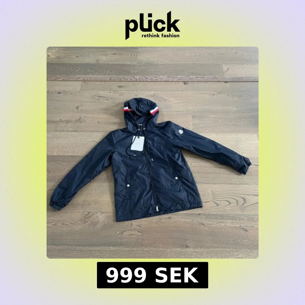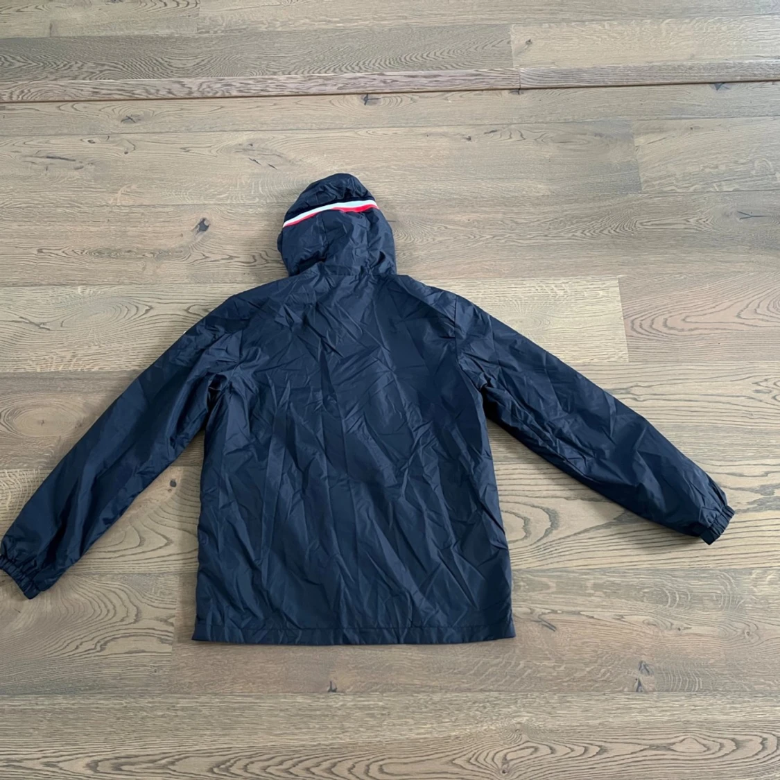 Mörkblå regnjacka från Moncler med huva och snygga rödvita detaljer på kanten. Jackan har dragkedja framtill, snörning vid huvan och två fickor med tryckknappar. Perfekt nu till hösten, pris kan diskuteras vid snabbaffär