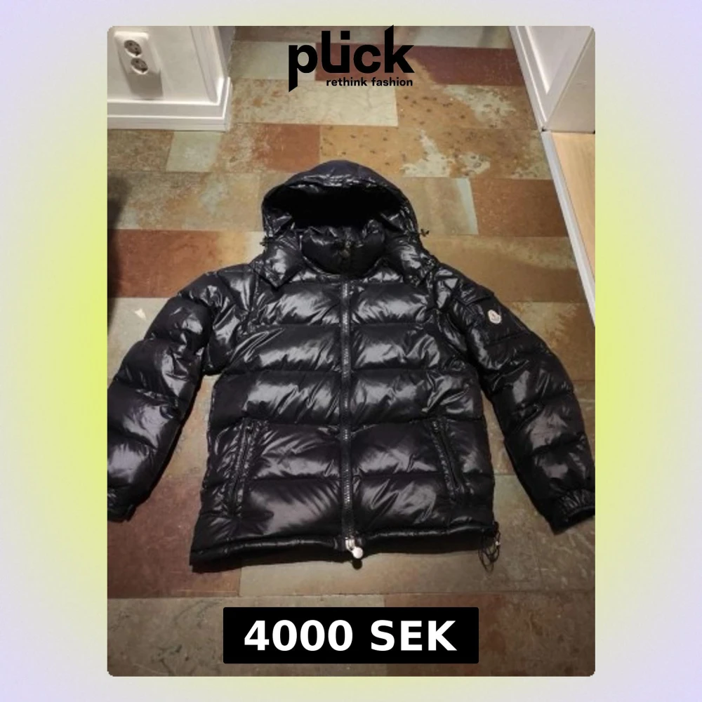 Snygg svart dunjacka från Moncler med glansig finish och klassisk logotyp på ärmen. Jackan har huva, dragkedja framtill och två sidofickor. Perfekt för kalla dagar och ger en riktigt trendig look.