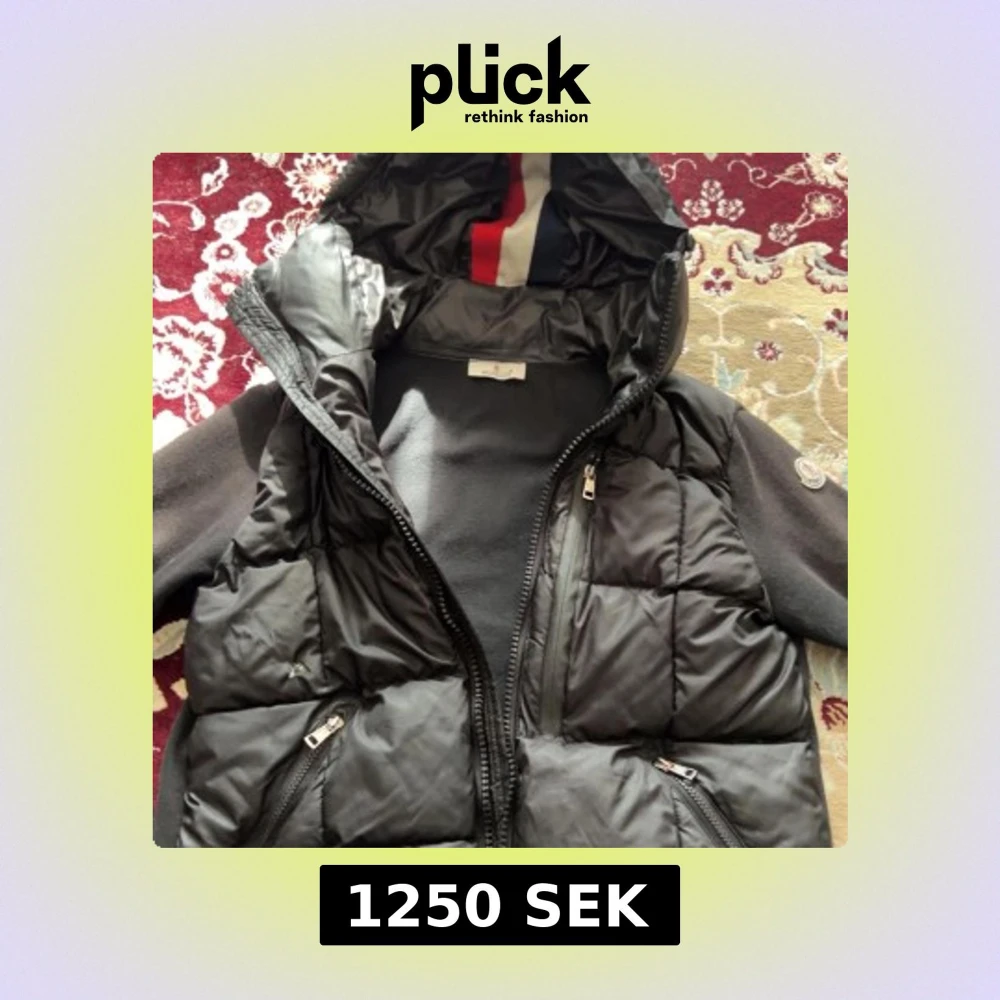 Svart pufferjacka från Moncler med huva och coola detaljer som dragkedjor på fickorna. Jackan har quiltad front och släta ärmar, samt Moncler-logga på ärmen. Insidan av huvan har röd, vit och marinblå rand. Perfekt för dig som vill ha en snygg och varm jacka.