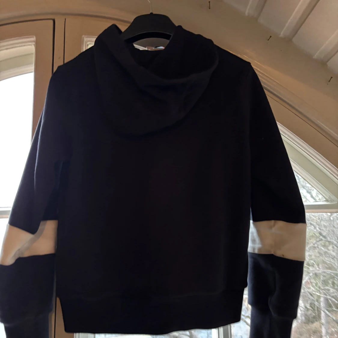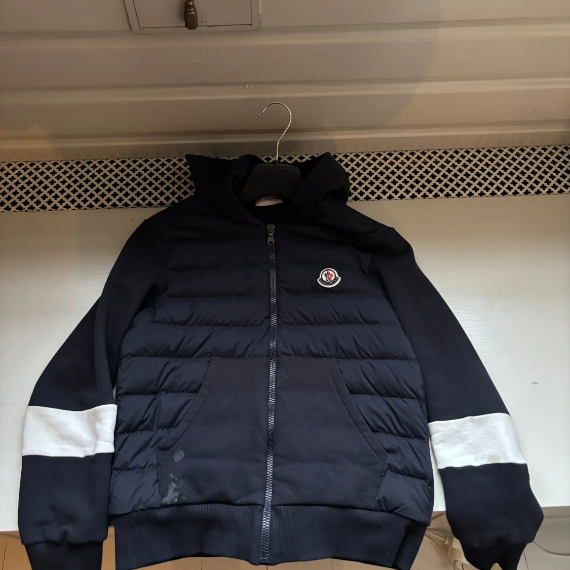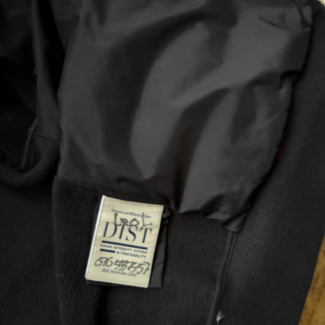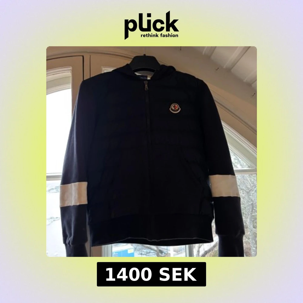 Snygg svart jacka från Moncler med huva och dragkedja. Jackan har vita detaljer på ärmarna och ett broderat märke på bröstet. Perfekt för kyligare dagar. Den är storlek 14 år
