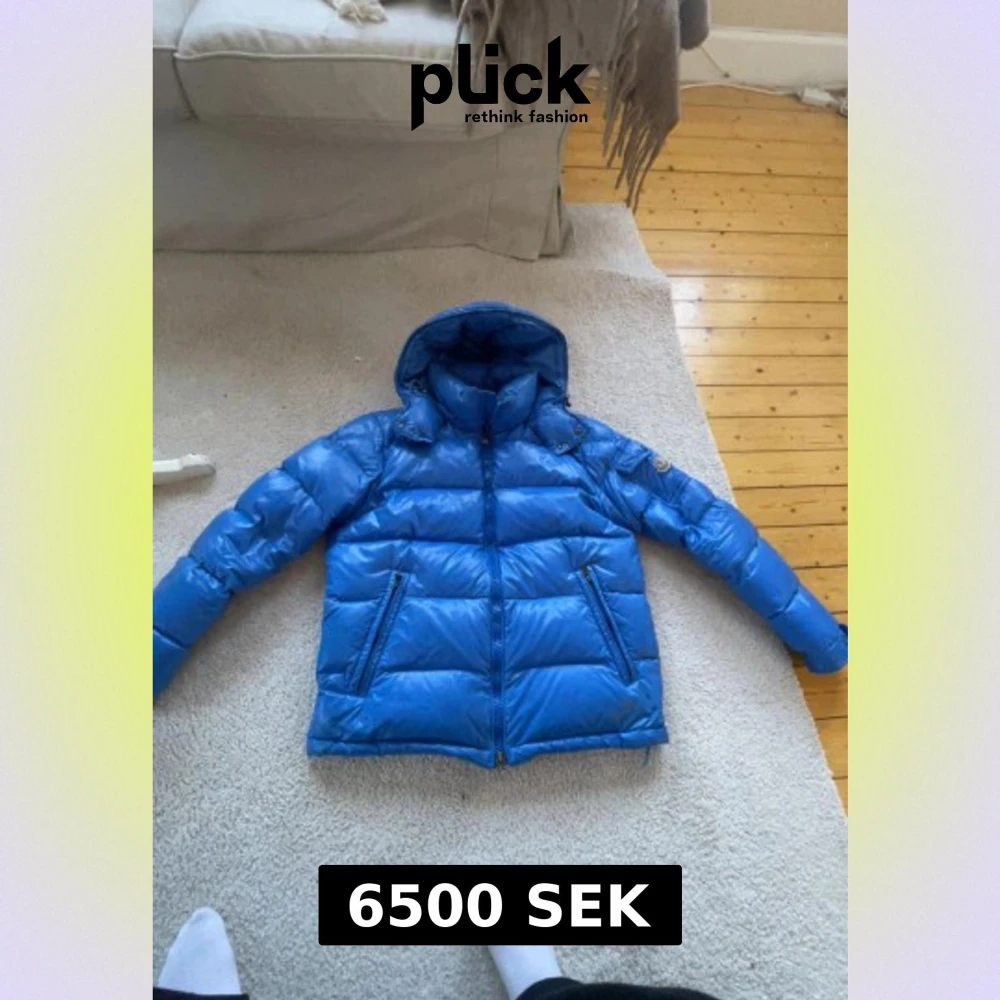 Säljer en blå pufferjacka från Moncler med huva och dragkedja framtill. Jackan har två sidofickor med dragkedja och klassisk Moncler-logga på ärmen. Materialet är glansigt och fyllt med dun för extra värme. Perfekt för dig som vill ha en snygg och varm jacka i vinter.