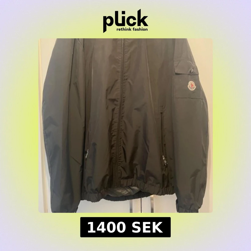 Säljer en svart vindjacka från Moncler med luva och dragkedja framtill. Jackan har Moncler-logga på ärmen, fickor med dragkedja och elastiska muddar vid ärmslut och nederkant. Perfekt för blåsiga dagar. Har prislapp men den sitter inte på jackan.
