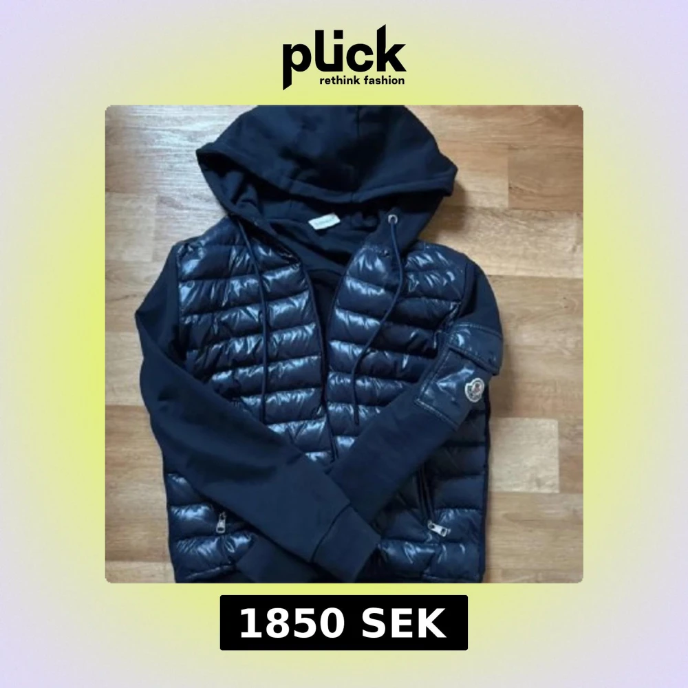 Snygg svart jacka från Moncler med huva och dragkedja. Jackan har en quiltad design på framsidan och ärmar i ett mjukare material. Perfekt för en stilren look.