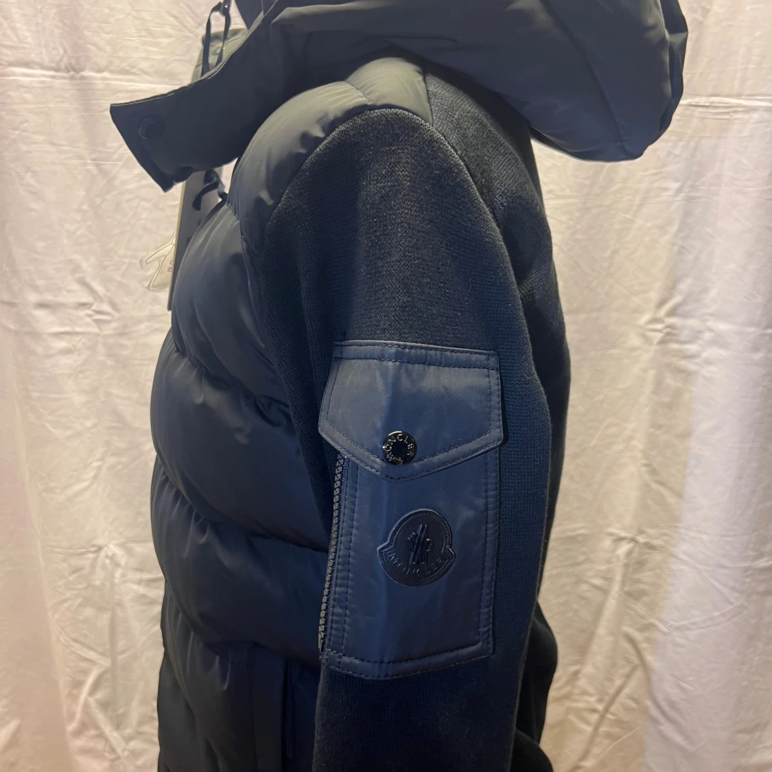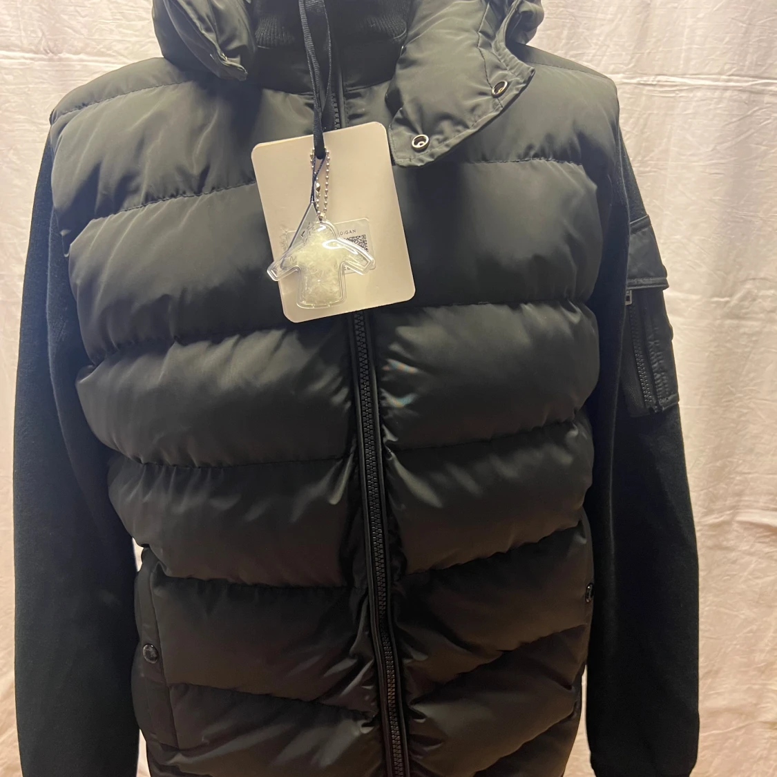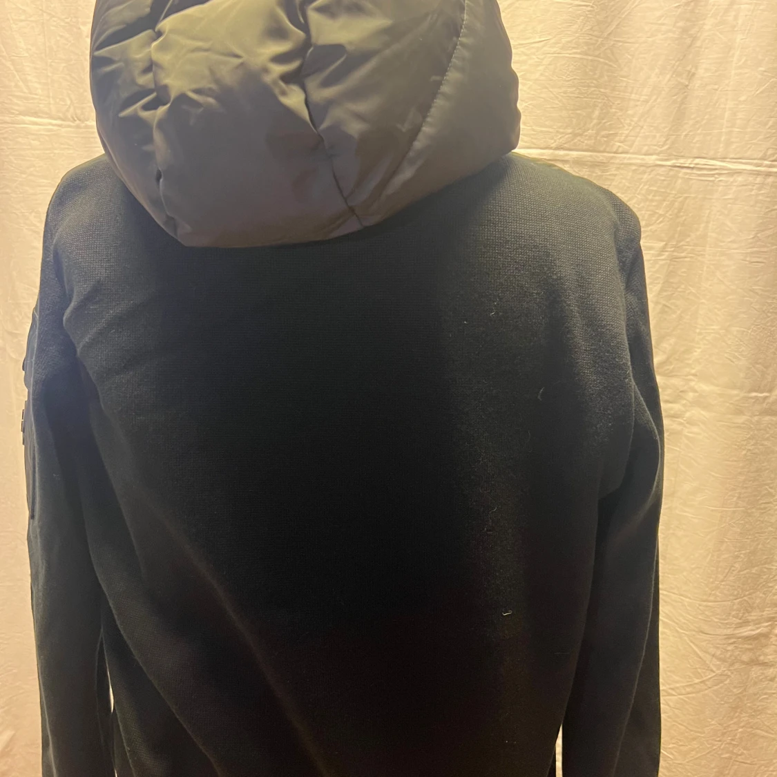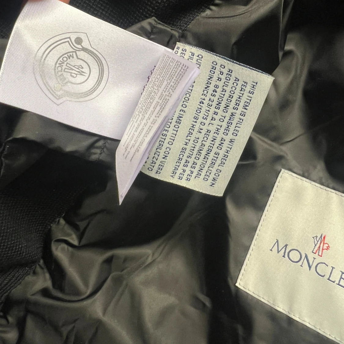 Svart dunväst från Moncler med quiltad framsida, huva och dragkedja. Västen har en snygg Moncler-logga på ärmen och praktisk ficka med knapp. Materialet är polyester och dun, perfekt för kyliga dagar. Stilsäker och sportig look med klassiska detaljer.