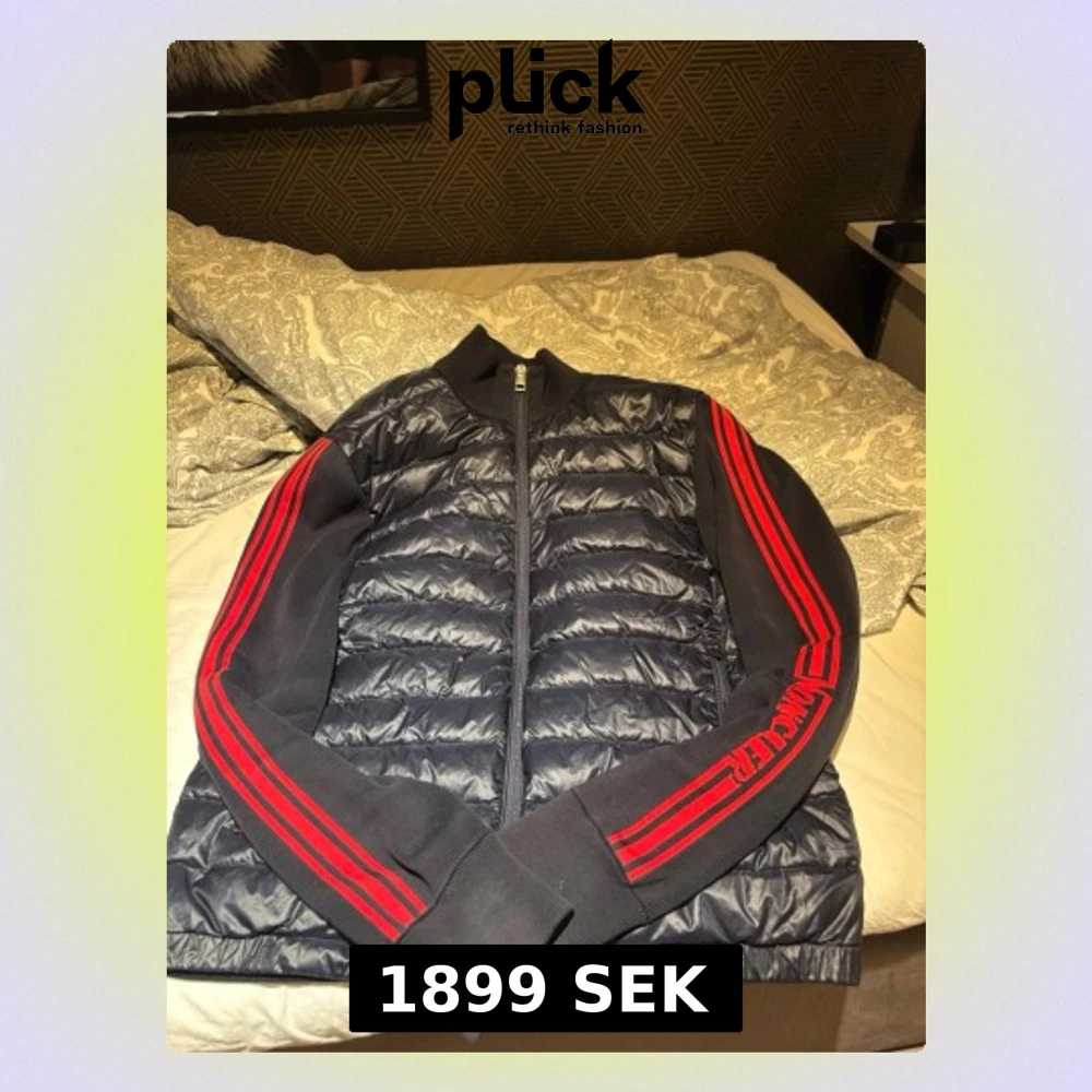 Storlek S.Snygg pufferjacka från Moncler i mörkblå med quiltad framsida och stickade ärmar. Ärmarna har röda ränder och Moncler-logga. Jackan har dragkedja framtill och sidofickor med dragkedja. Perfekt för dig som vill ha en sportig och modern look.
