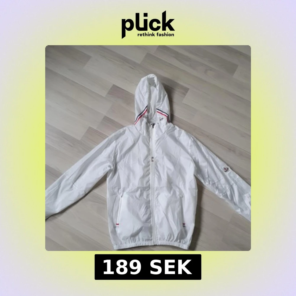 Snygg vit vindjacka från Chase med huva och dragkedja framtill. Jackan har Moncler-logga på ärmen och detaljer i rött, vitt och marinblått vid huvan och fickorna. Tillverkad i lätt polyester, perfekt för blåsiga dagar. Sportig och stilren look.