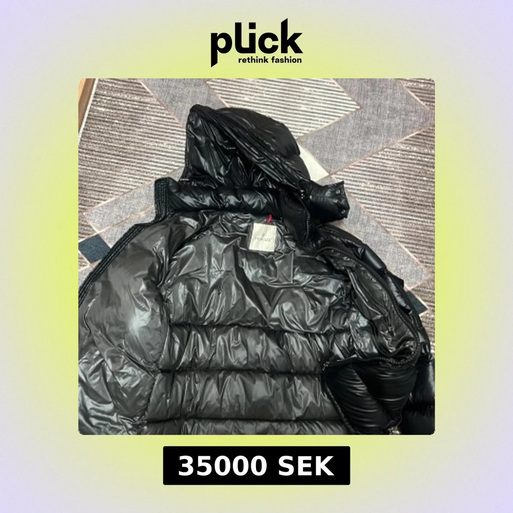 Säljer en svart dunjacka från Moncler med glansig finish och huva. Jackan har en klassisk Moncler-logga på ärmen, dragkedjor och stora quiltade partier. Perfekt för kalla dagar när du vill hålla stilen och värmen.