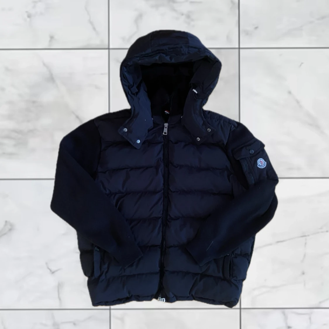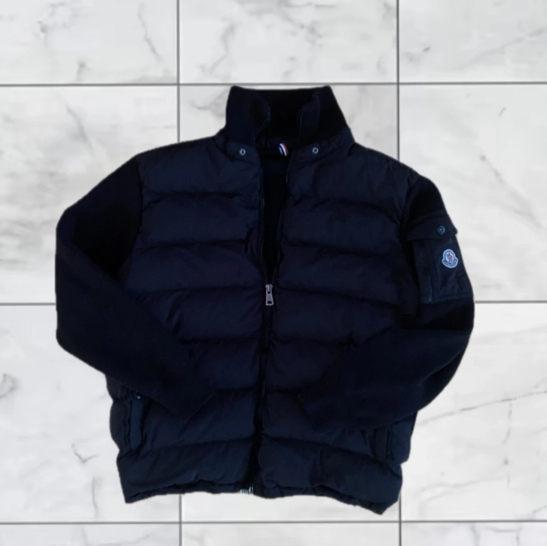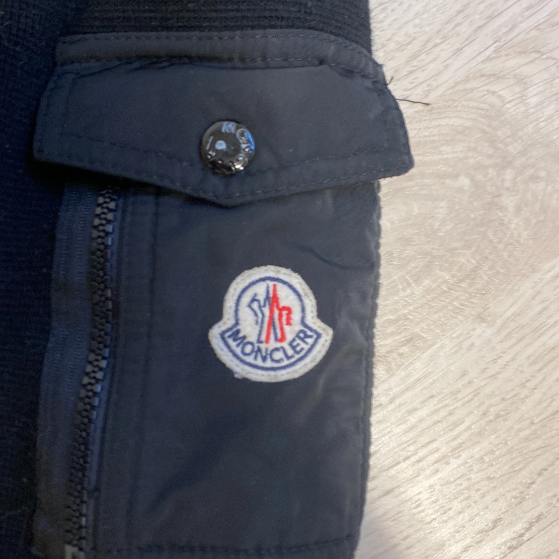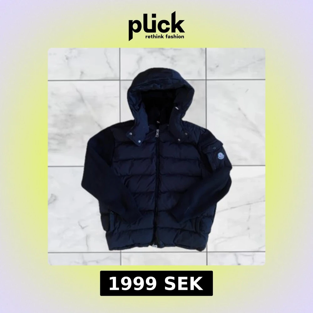 Säljer en svart pufferjacka från Moncler med huva och dragkedja. Jackan har quiltad framsida, långärmade ärmar och en Moncler-logga på ena ärmen. Perfekt för kyligare dagar.