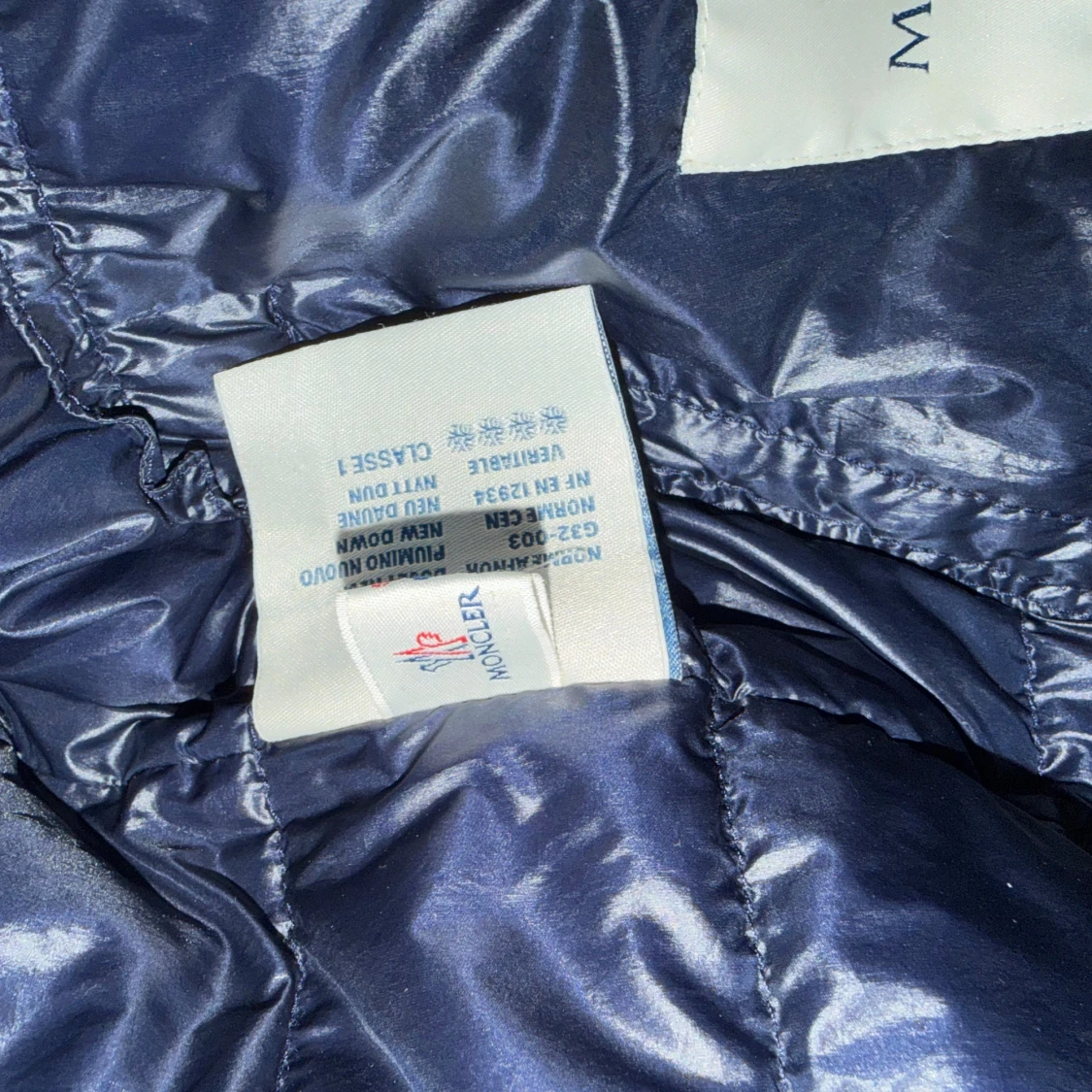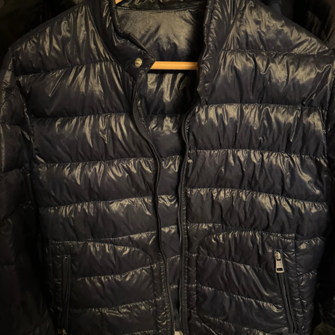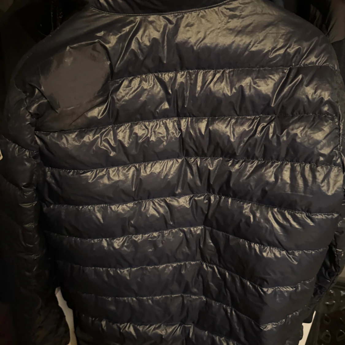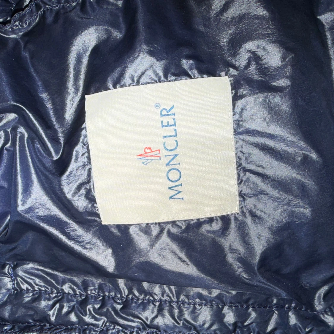 Säljer en mörkblå pufferjacka från Moncler med glansig finish och klassisk logga på ärmen. Jackan har dragkedja framtill, ståkrage och två fickor med dragkedja. Perfekt för dig som vill ha en stilren och varm jacka med exklusiv känsla. Lagad på bakisida kolla bild 3