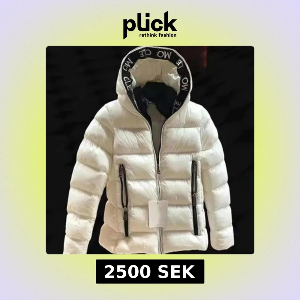 Snygg vit pufferjacka från Moncler med svart text på huvkanten. Jackan har två svarta dragkedjefickor framtill och en rejäl huva. Perfekt för kalla dagar och ger en clean, modern look.