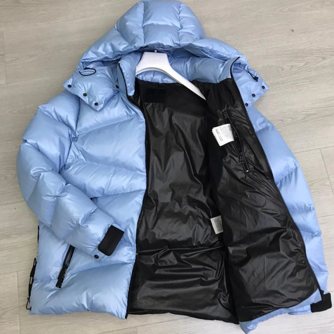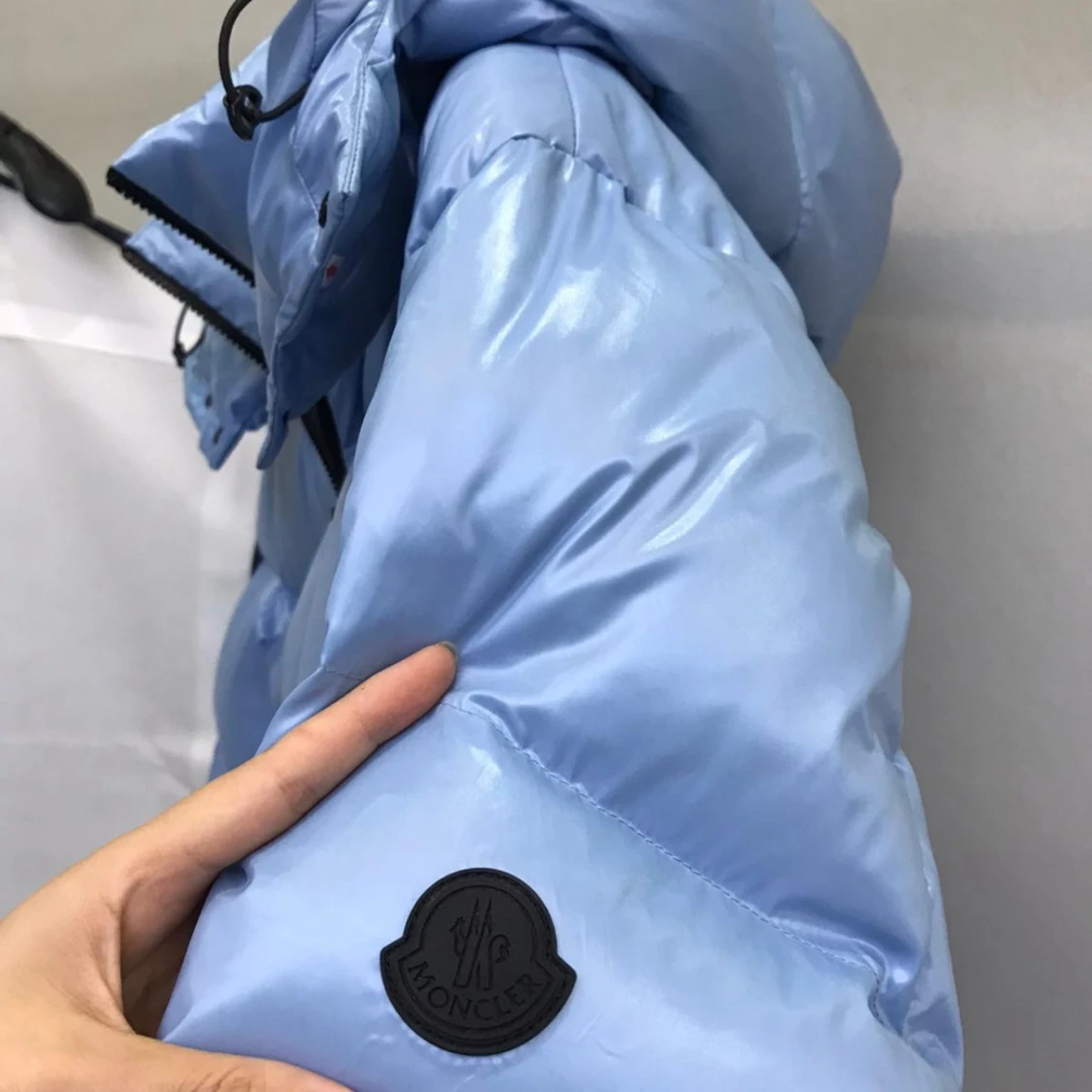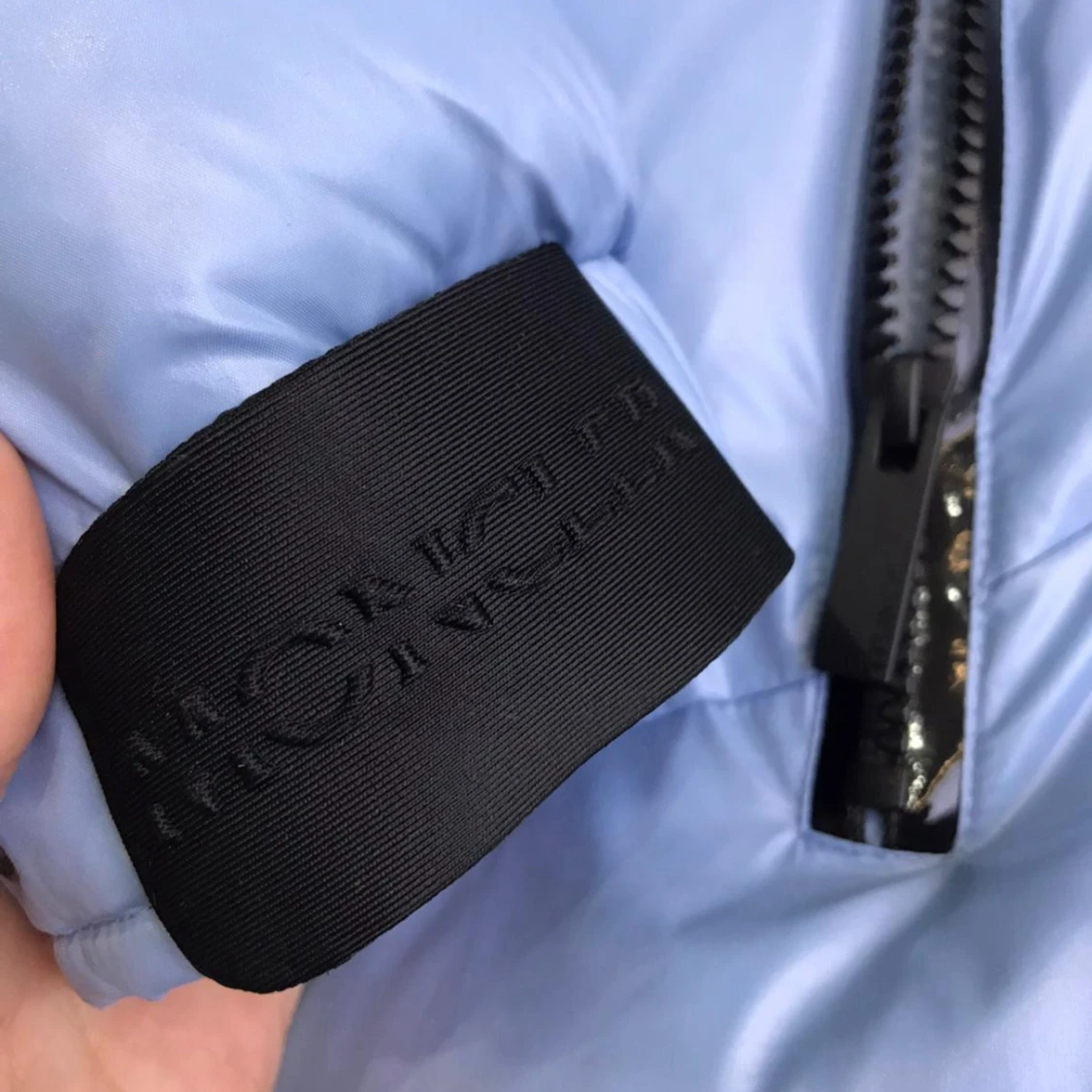 Säljer en sjukt snygg ljusblå dunjacka från Moncler med stor huva och svarta detaljer. Jackan har dragkedja framtill, två snedställda fickor med dragkedja och breda svarta muddar vid ärmsluten. Perfekt för kalla dagar när du vill vara både varm och stilren. Kontakta via Snapchat: maisonla_drippo för eventuella rabatter på denna produkt