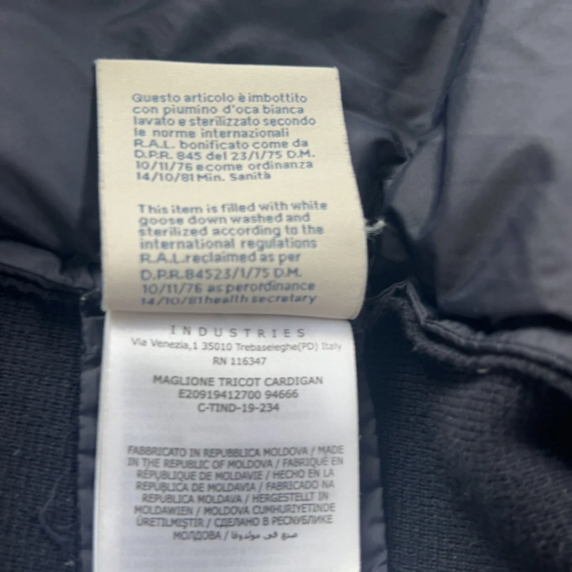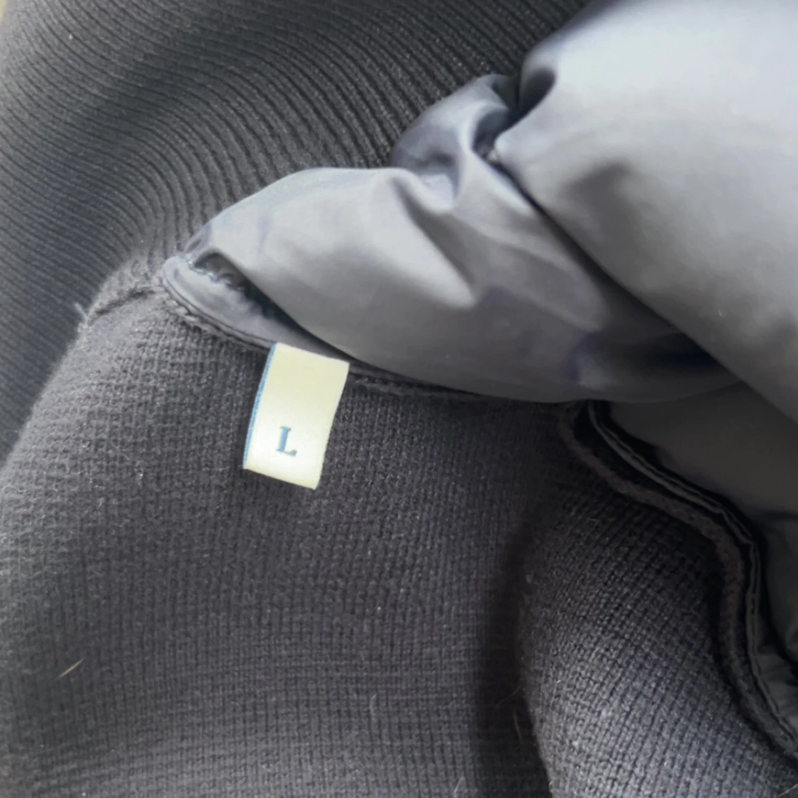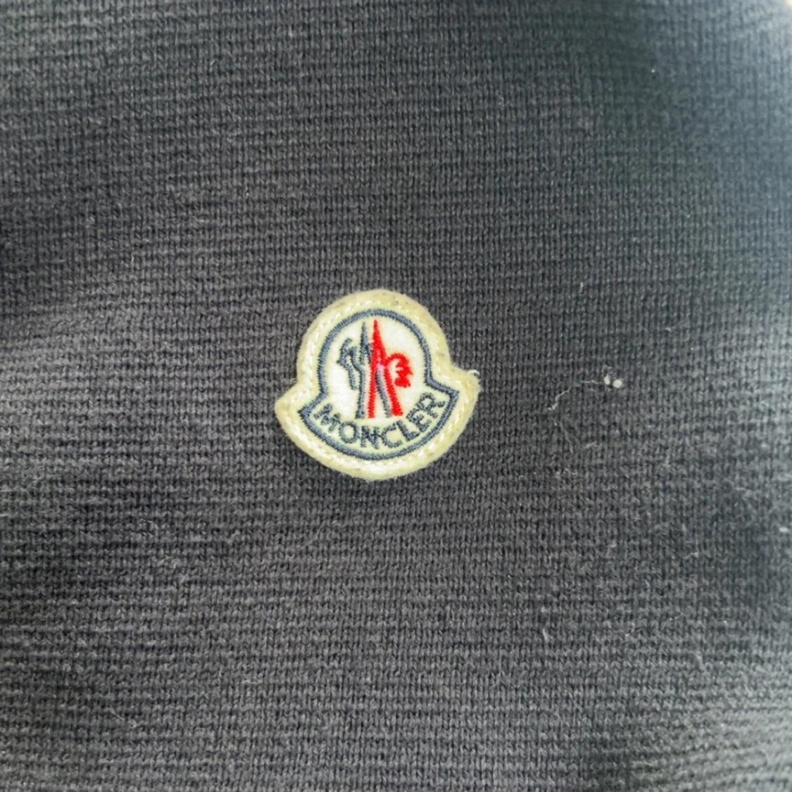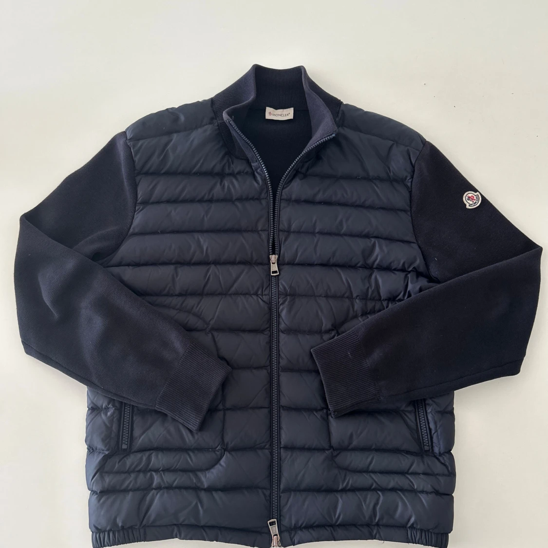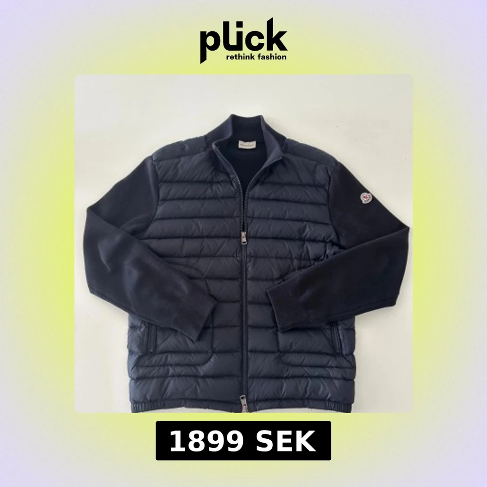 Säljer en marinblå cardigan från Moncler med stickade ärmar och quiltad front. Jackan har dragkedja, ribbade muddar och Moncler-logga på ena ärmen. Fylld med vitt gåsdun för extra värme. Perfekt för dig som vill ha en clean och stilren look. Hör av er vid frågor