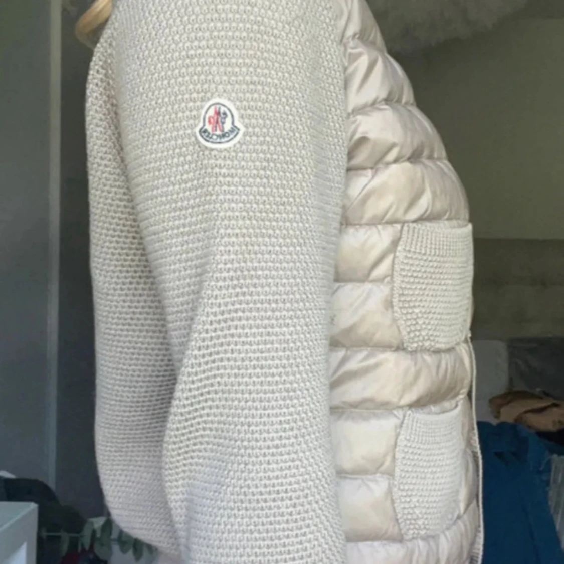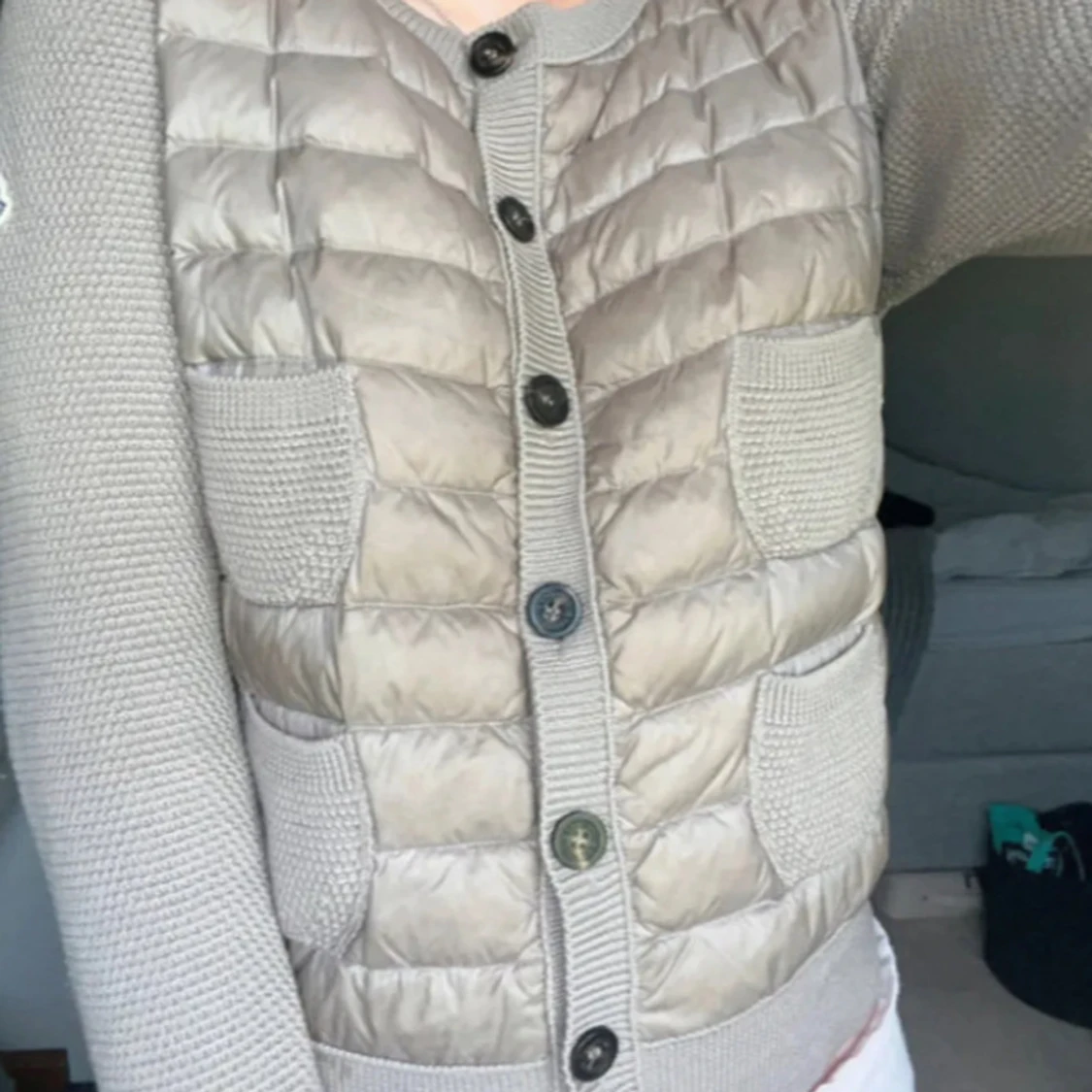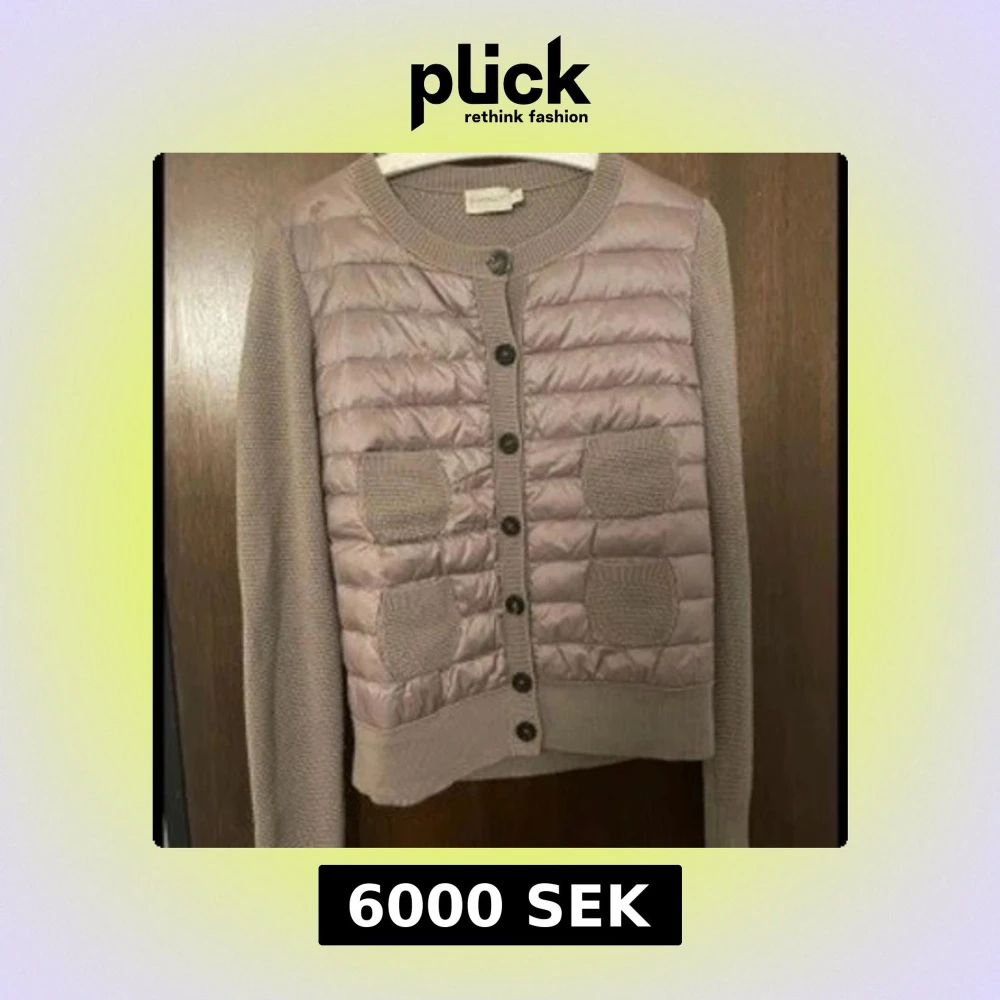 Snygg beige/brun quiltad cardigan jacka från Moncler med stickade ärmar och två stickade fickor framtill. Fint skick, några trådar som sticker ut på ärmen men går enkelt att få tillbaka med en virknål. I övrigt fint skick, inga hål eller liknande. Storlek L men passar även mindre då de är små i storleken