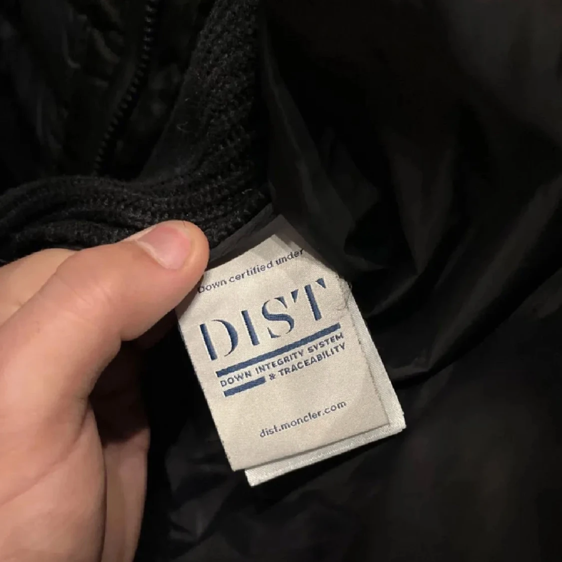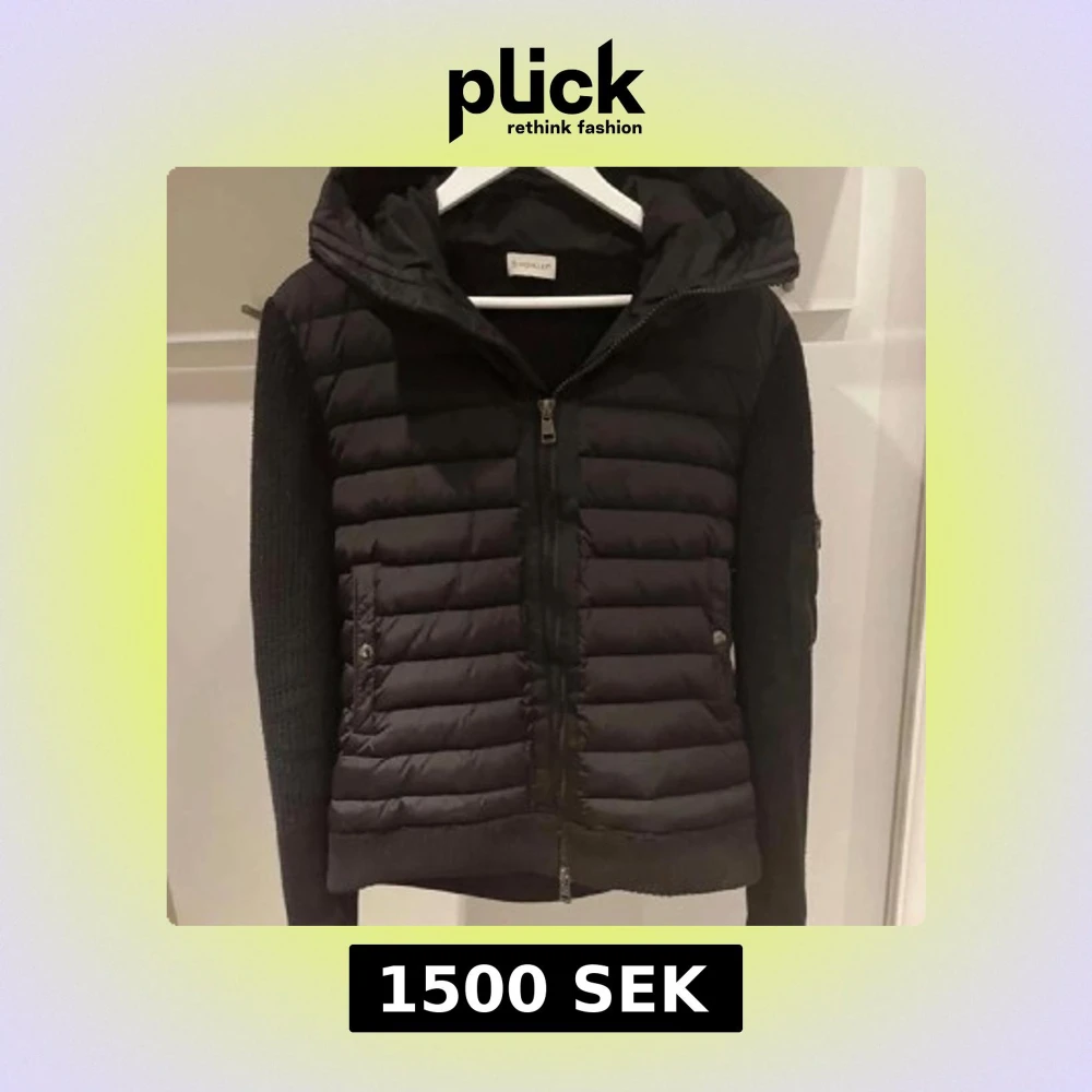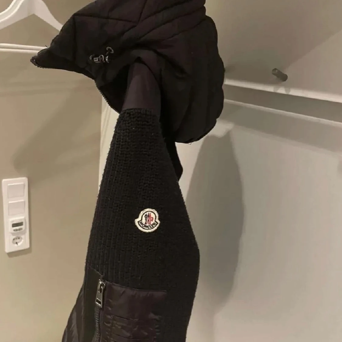 Säljer en svart pufferjacka från Moncler med stickade ärmar och huva. Jackan har dragkedja framtill, två fickor med knappar och Moncler-logga på ärmen. Perfekt för kyliga dagar och snygg till vardags. Aldrig använd 10/10 skick , säljer för den passade liten