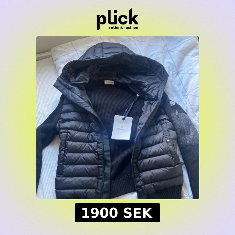 Säljer en svart pufferjacka från Moncler med stickade ärmar och huva. Jackan har dragkedja framtill, två fickor med knappar och en patch på ena ärmen. Perfekt för kyliga dagar och riktigt snygg streetstil.