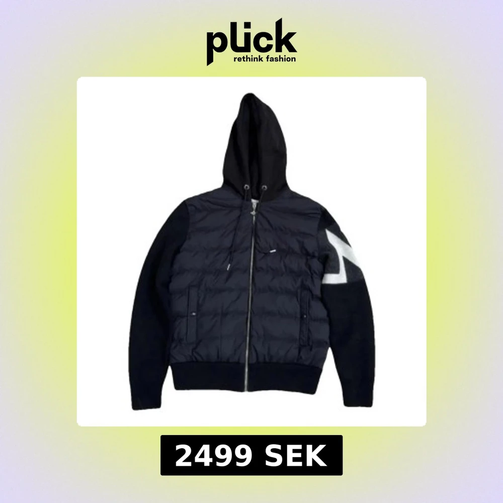 Svart Moncler dunjacka med stickade ärmar och stor huva. Jackan har dragkedja framtill, quiltad front och ett vitt grafiskt mönster på ena ärmen samt Moncler-logga. Fet och passar till allt. Jackan passar S/M Hör av er vid minsta fundering eller prisförslag