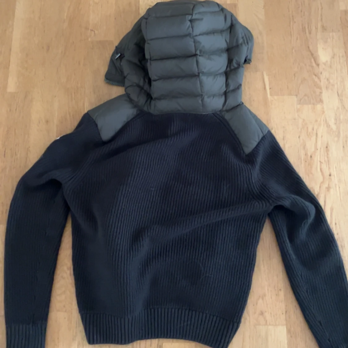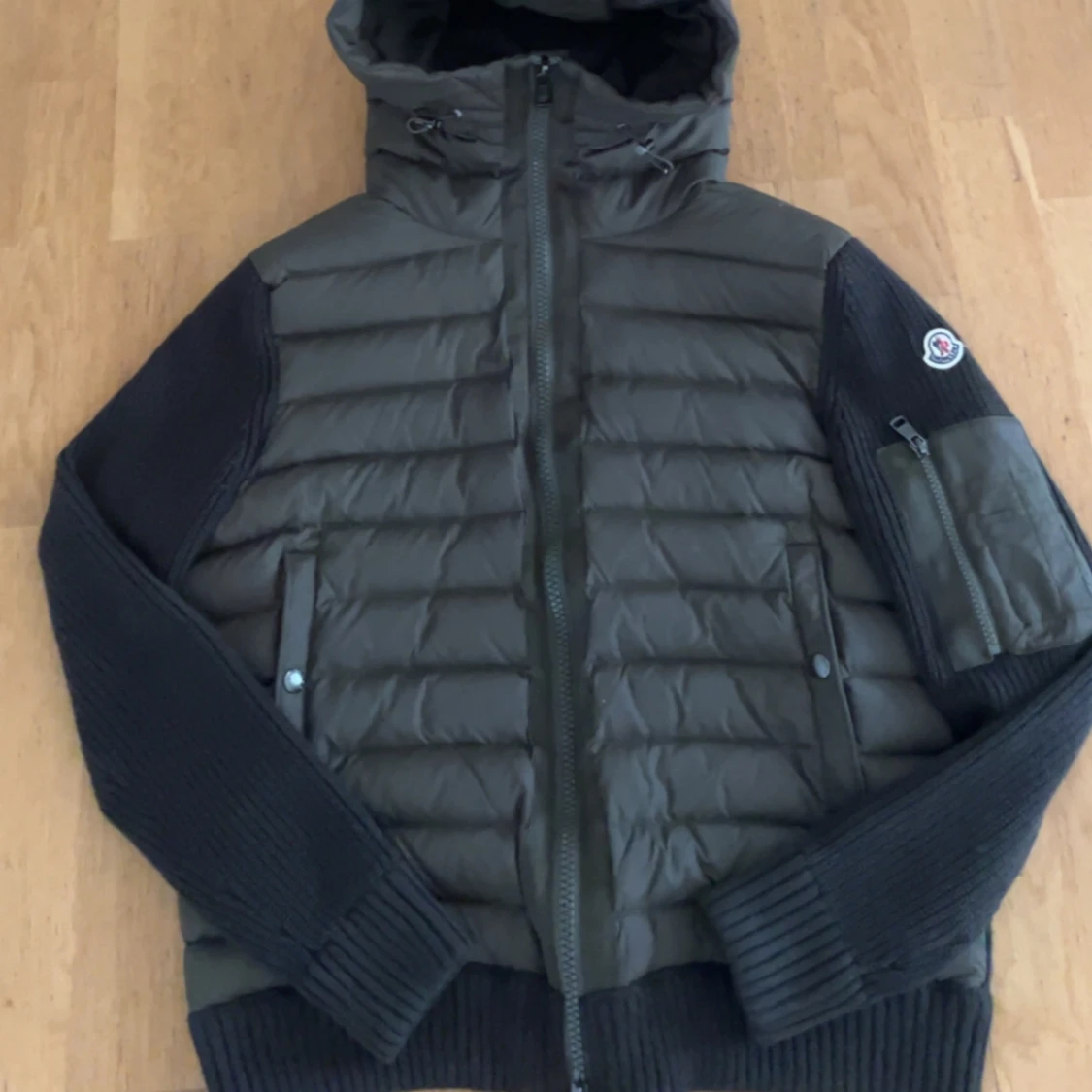 Snygg Cardigan från Moncler i mörkgrönt med gröna stickade ärmar och detaljer. Jackan har huva, dragkedja framtill och på ärmen samt Moncler-logga på vänster arm. Hör av er vid intresse!