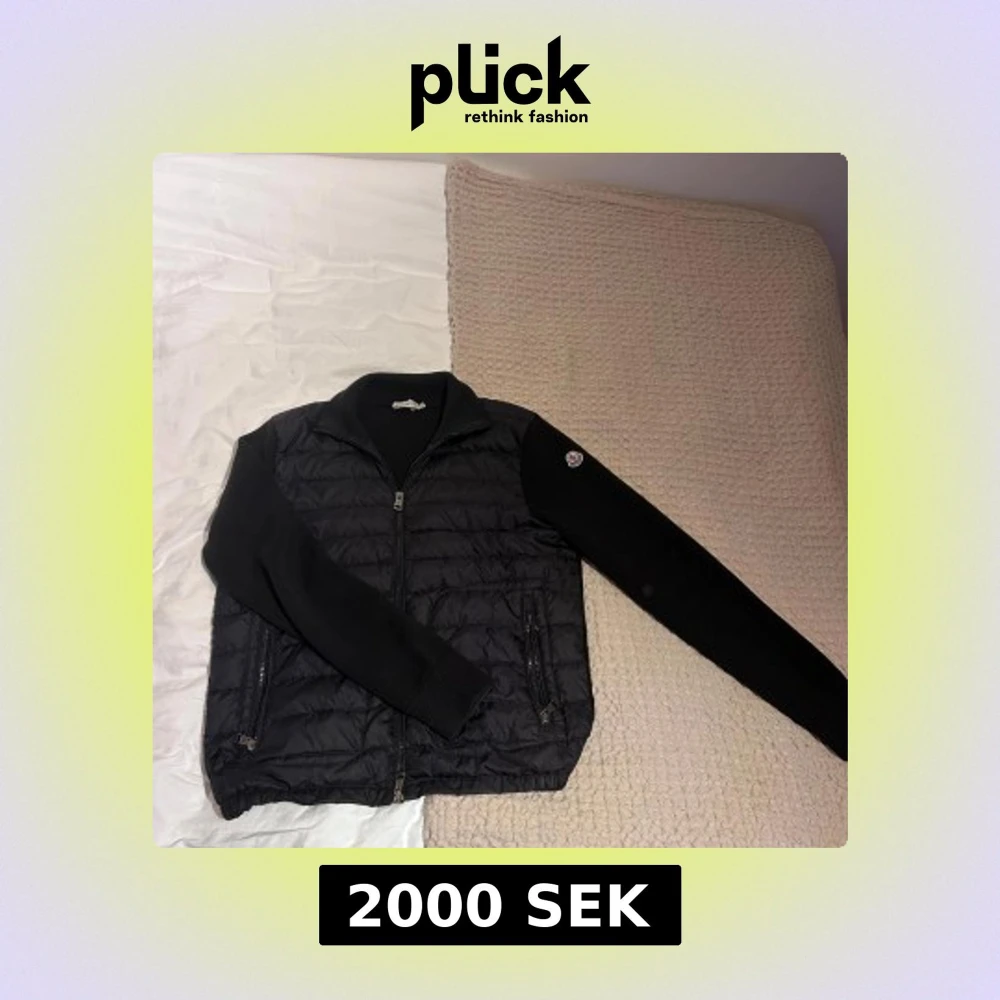 Säljer en svart cardigan jacka från Moncler med quiltad front och ärmar i stickad bomull. Jackan har dragkedja framtill, två fickor med dragkedja och Moncler-logga på ena ärmen. Perfekt för lager-på-lager under höst och vår. Den har en liten defekt på framsidan som man kan se på sista bilden men man märker inte den