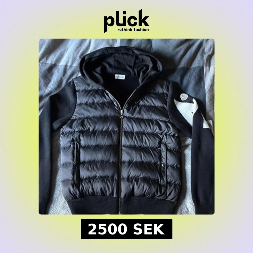 Svart pufferjacka från Moncler med huva och dragkedja framtill. Jackan har stickade ärmar