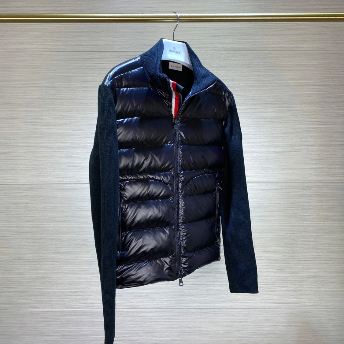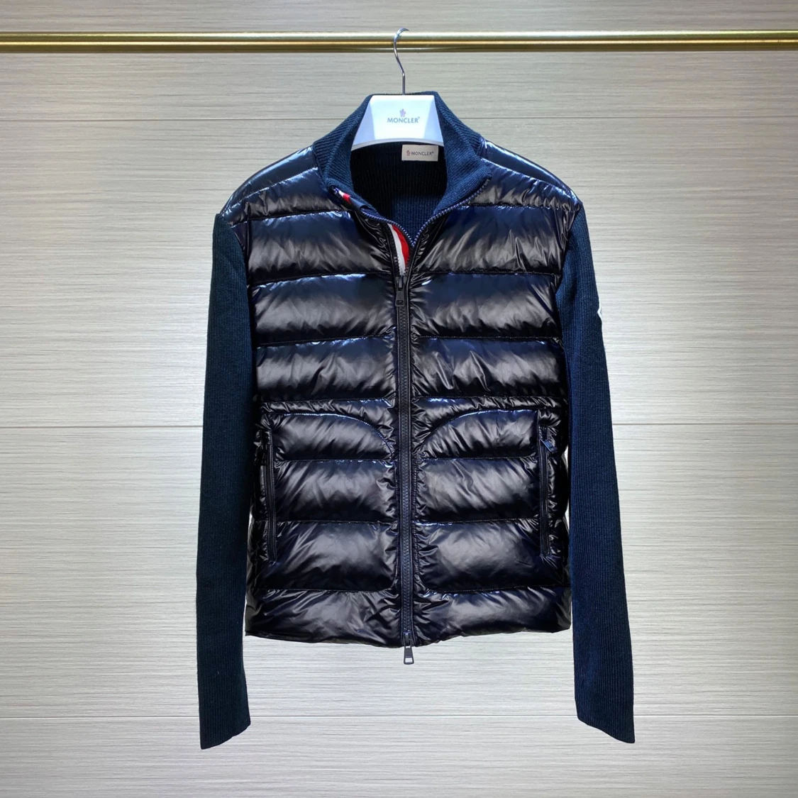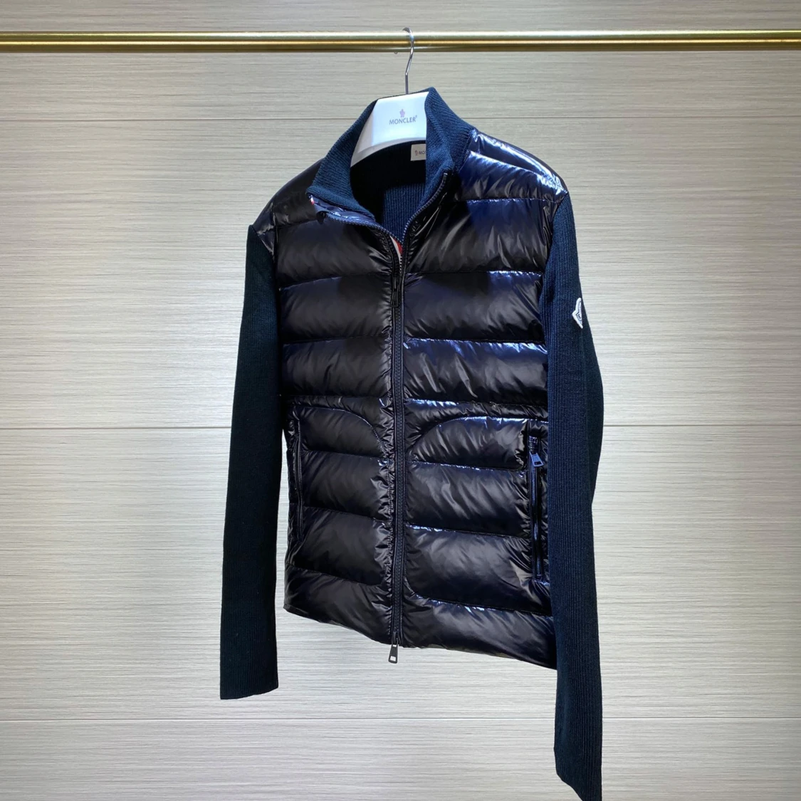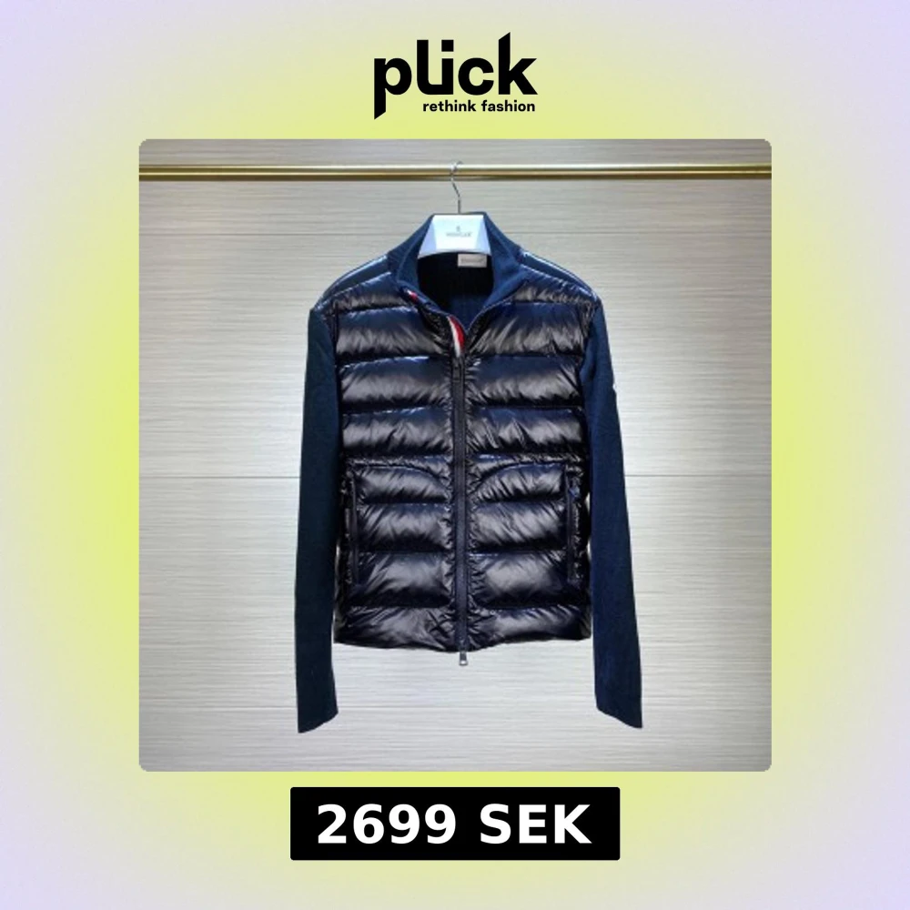 Snygg mörkblå cardigan från Moncler med glansig quiltad framsida och dragkedja. Jackan har ribbstickade mörkblå sidor och ärmar, samt diskret logga på ena ärmen. Perfekt för lager-på-lager look. Kontakta via Snapchat: för eventuella rabatter på denna produkt