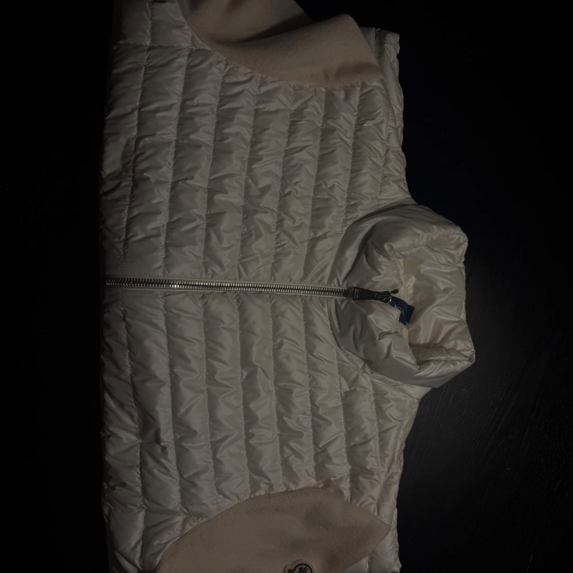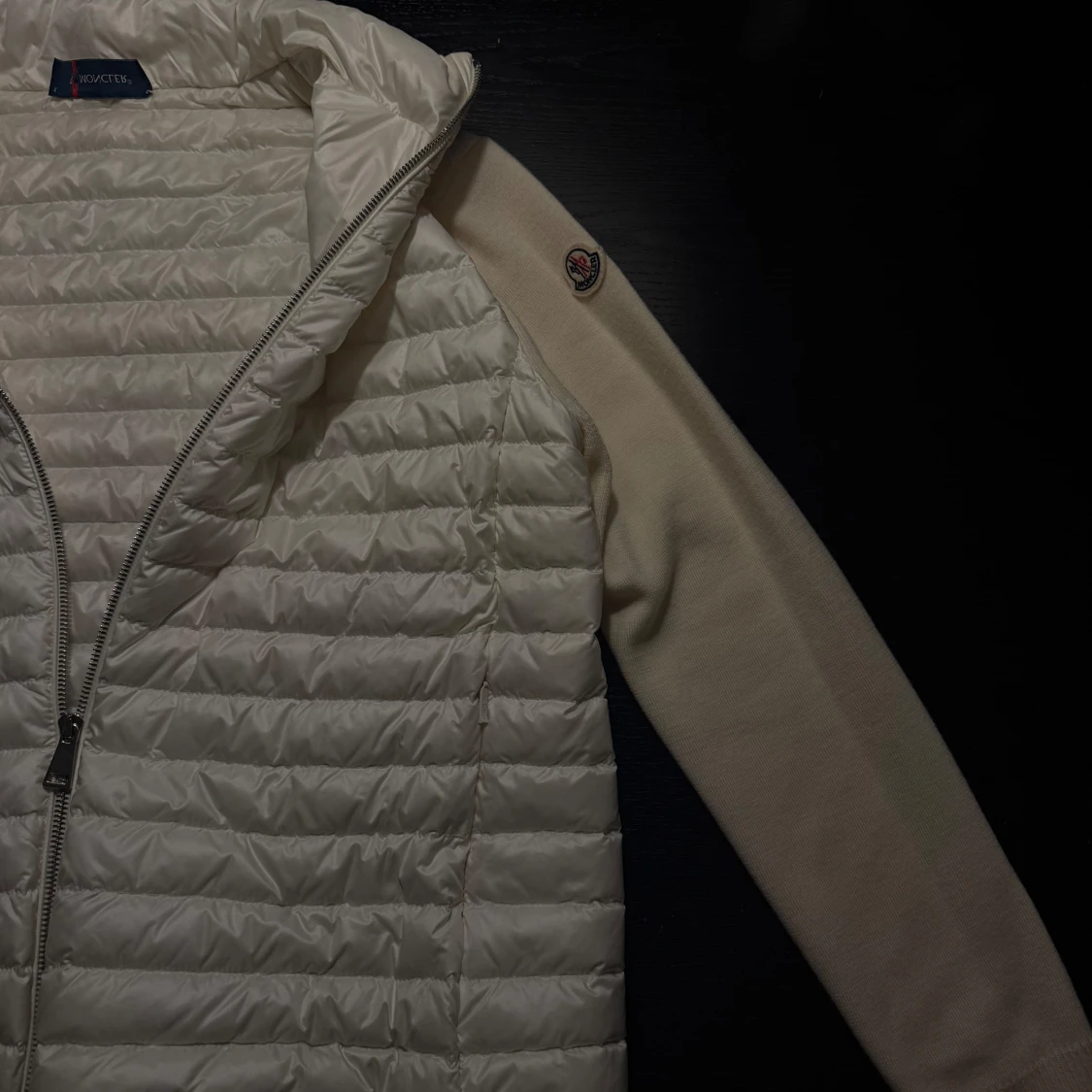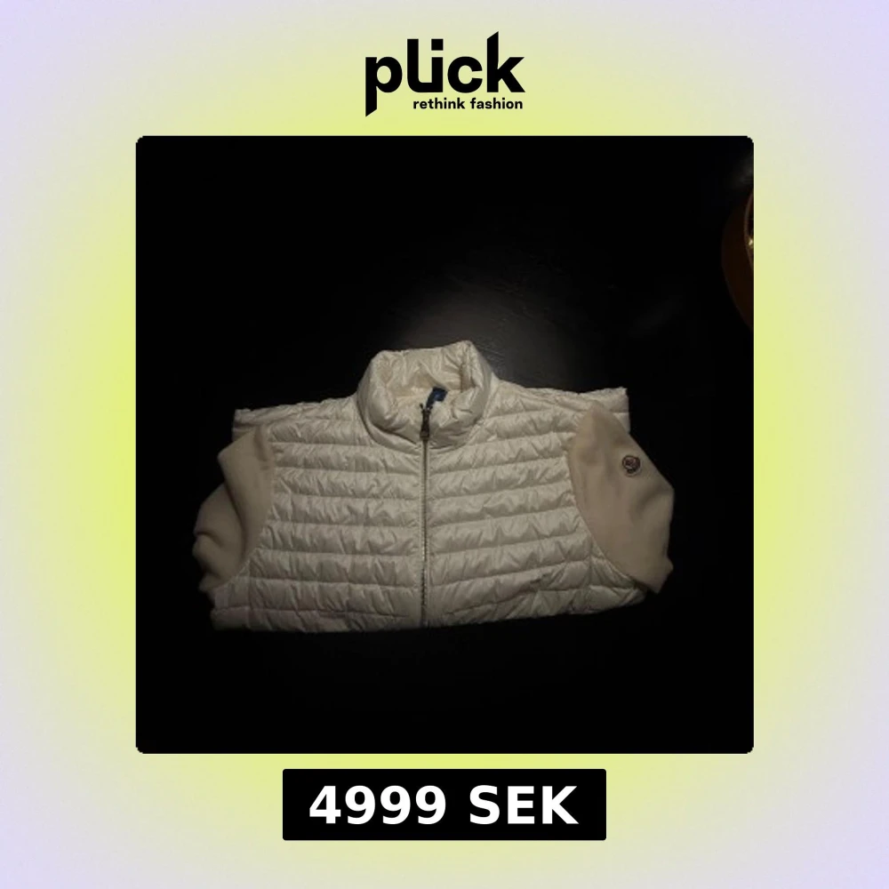 Moncler cardigan med quiltad framsida och ärmar i mjuk stickad kvalitet. Jackan har dragkedja framtill och en liten logga på ärmen. Perfekt för dig som vill ha en clean och stilren look. Har äkthetsbevis i form av prislapp och kvitto. Nypris 8400kr