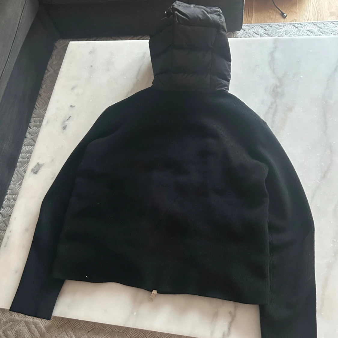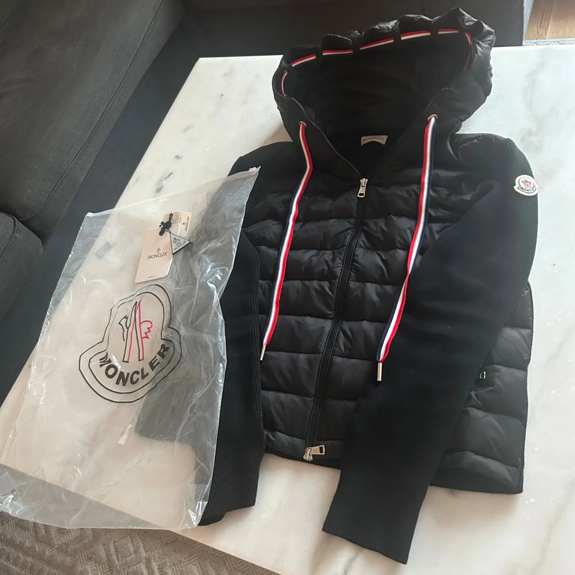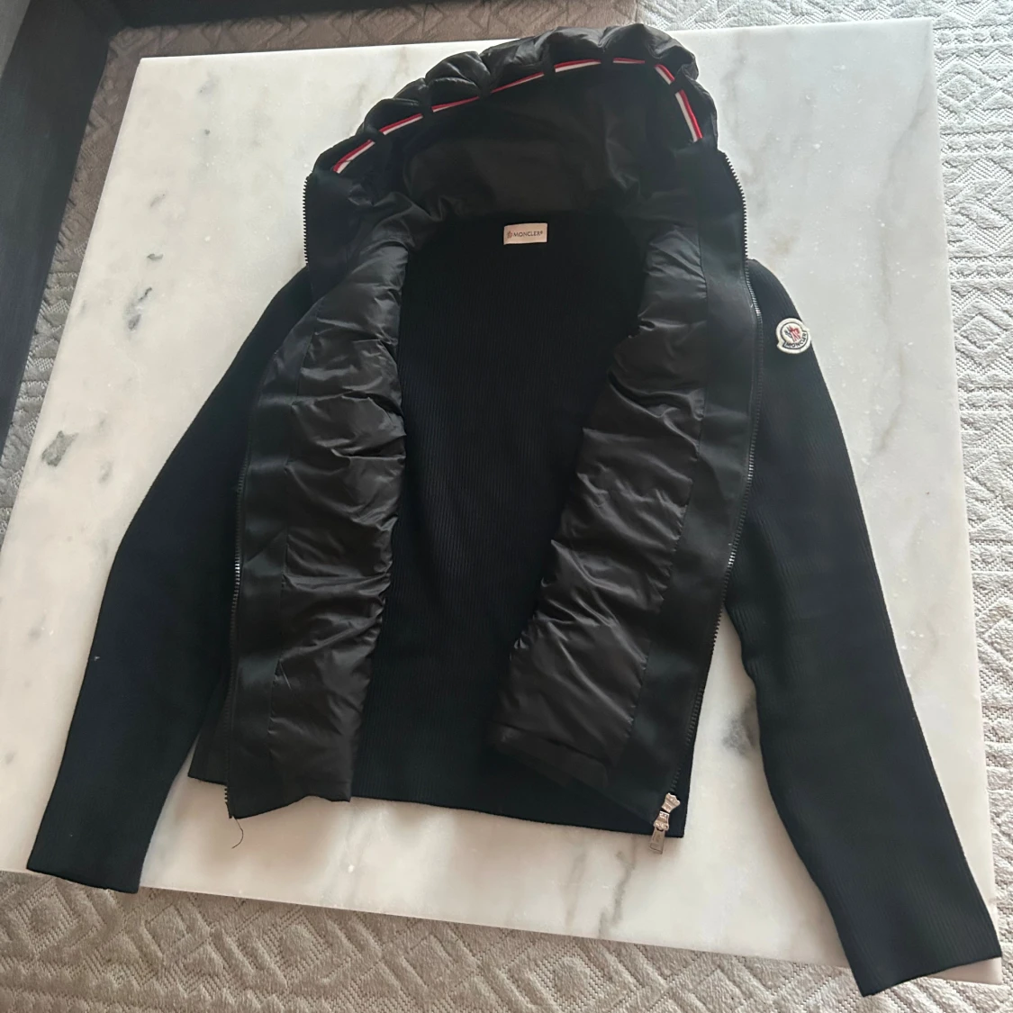 Svart pufferjacka från Moncler med stickade ärmar och quiltad front. Jackan har huva med röd, vit och blå snörning, dragkedja framtill och Moncler-logga på ärmen. Materialmix av polyester och stickad textil, perfekt för dig som vill ha en snygg streetstil. Skulle säga kan vara kort i kroppen fast ganska bra längd i armarna.