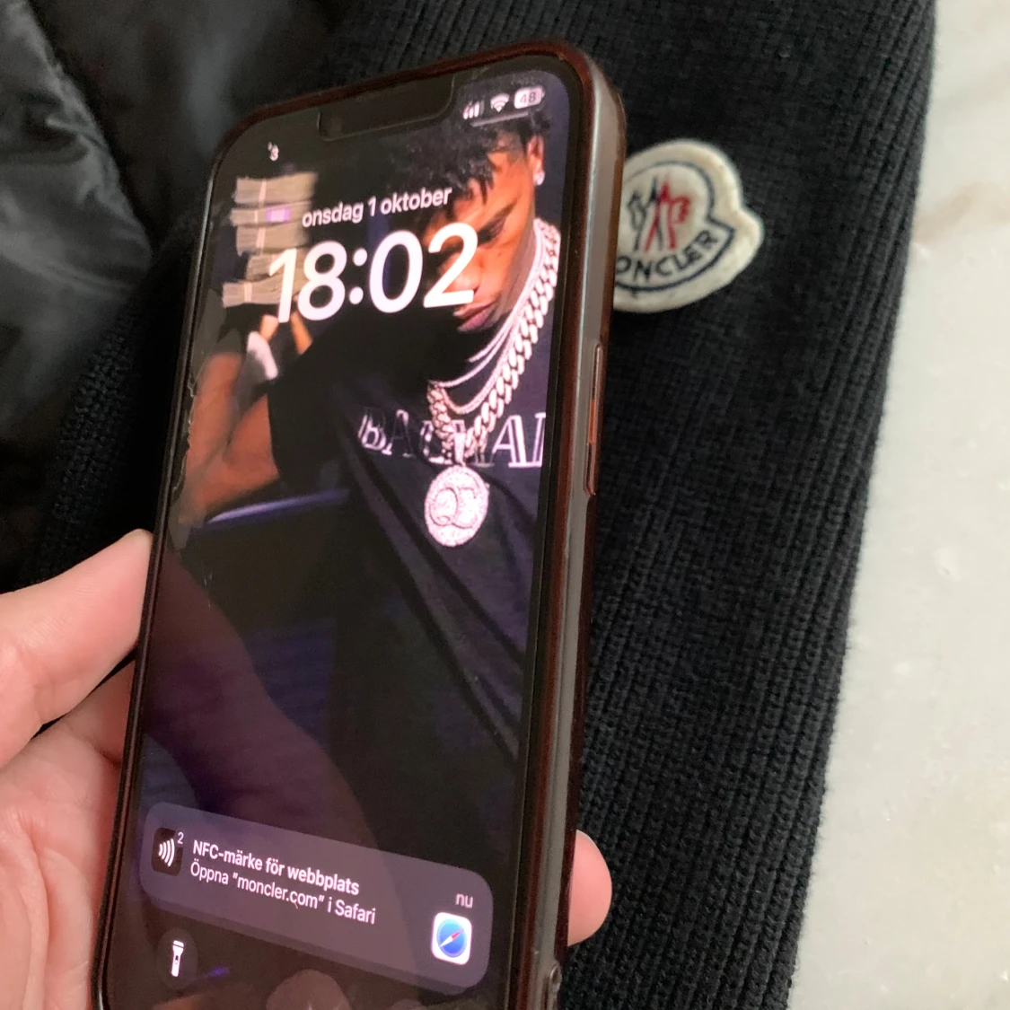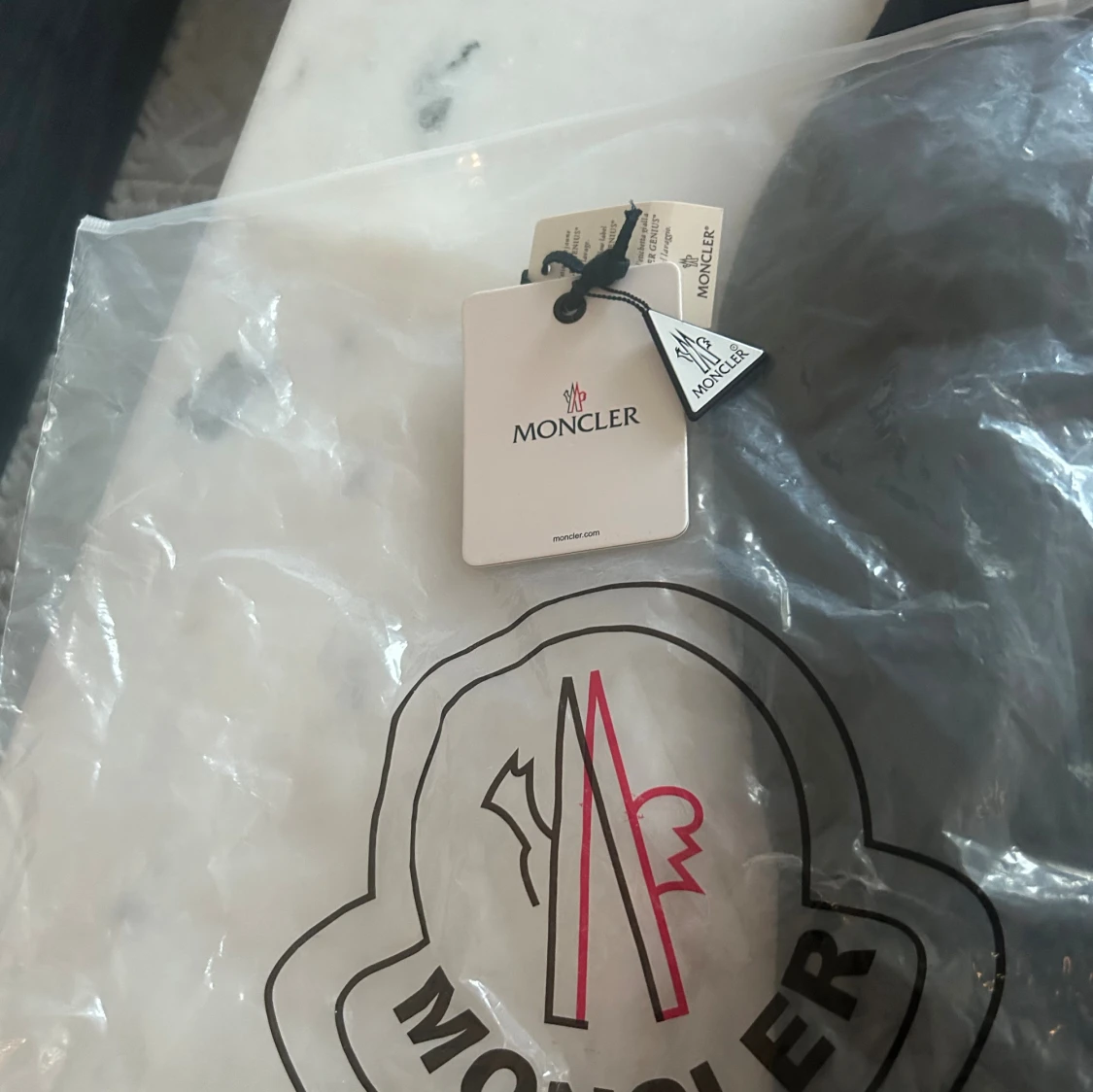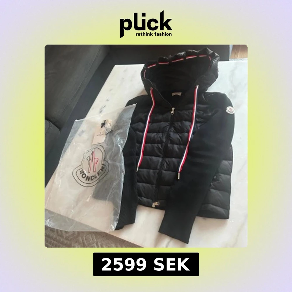 Svart pufferjacka från Moncler med stickade ärmar och quiltad front. Jackan har huva med röd, vit och blå snörning, dragkedja framtill och Moncler-logga på ärmen. Materialmix av polyester och stickad textil, perfekt för dig som vill ha en snygg streetstil. Skulle säga kan vara kort i kroppen fast ganska bra längd i armarna.