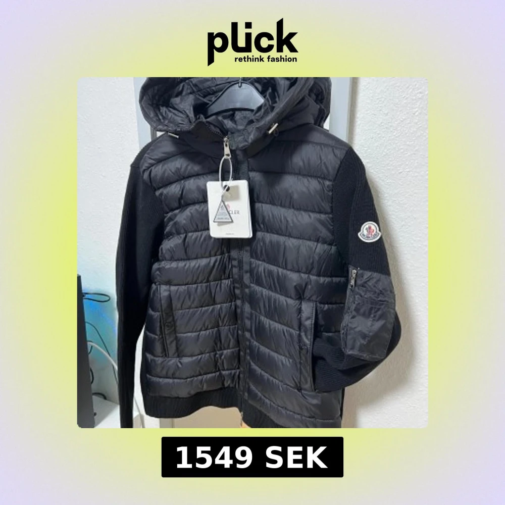 Svart moncler cardigan. Jackan har huva, dragkedja framtill och en extra ficka med dragkedja på ärmen. Moncler logga på vänster ärm. Snygg och modern look. passar M-L "är 80kg, 172cm och den passar mig" SKRIV FÖR MER INFO!