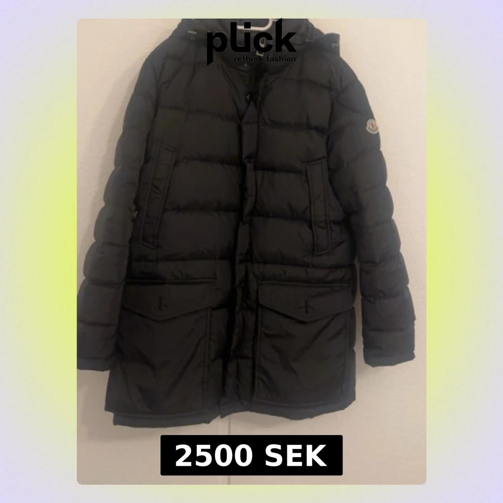 Säljer en svart Moncler dunjacka med snygg pälsdetalj på huvan. Jackan har långa ärmar, flera fickor med lock och dragkedja framtill. Klassisk Moncler-logga på ärmen och coolt serietryck på insidan. Perfekt för kalla dagar och riktigt stilren.