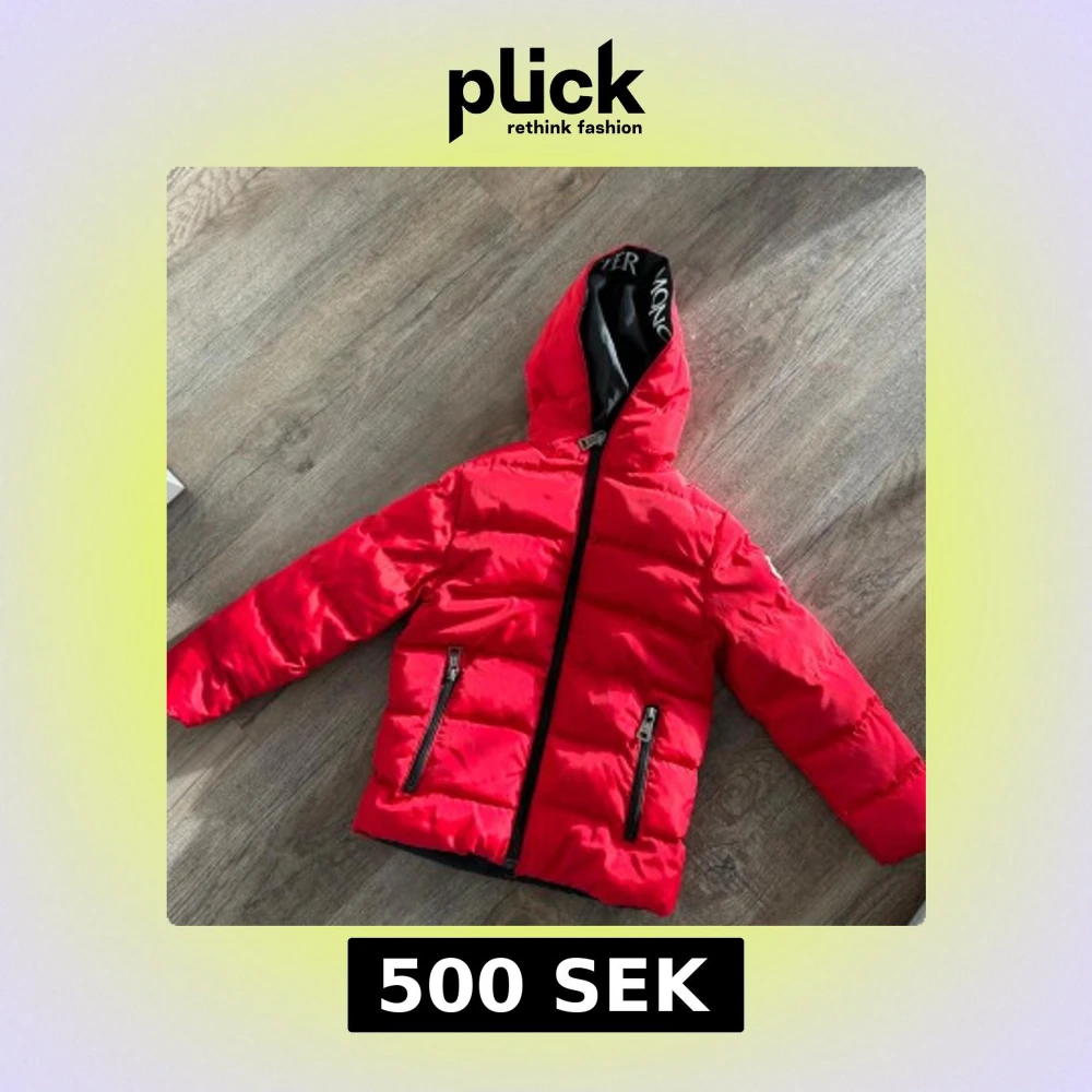 Snygg röd dunjacka från Moncler med svart foder och logotypdetaljer på insidan av huvan. Jackan har dragkedja och två fickor med dragkedjor framtill. Perfekt för kyliga dagar. stl 4 pris är inte hugget i sten