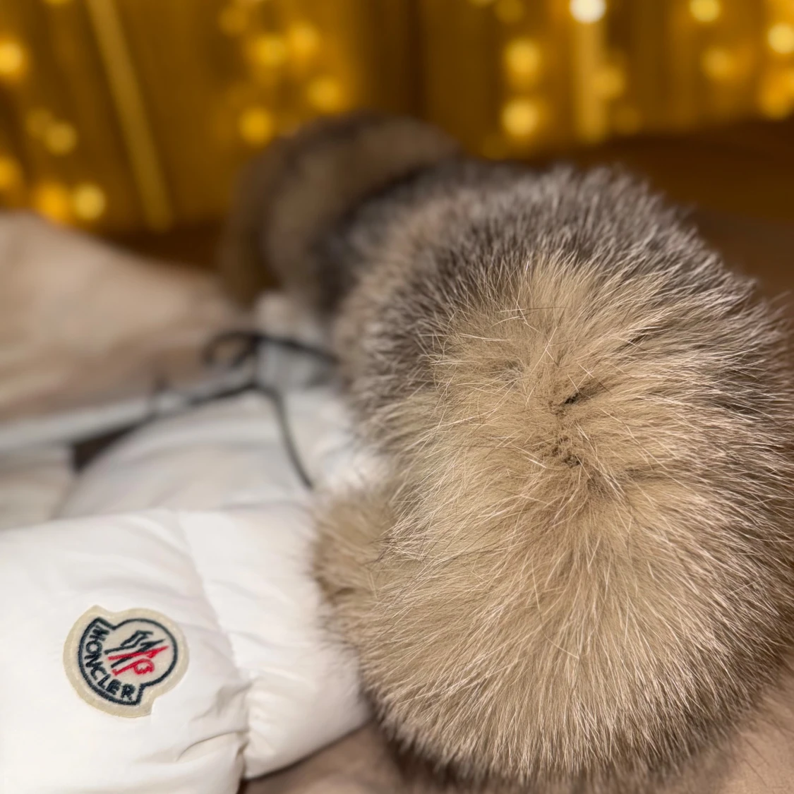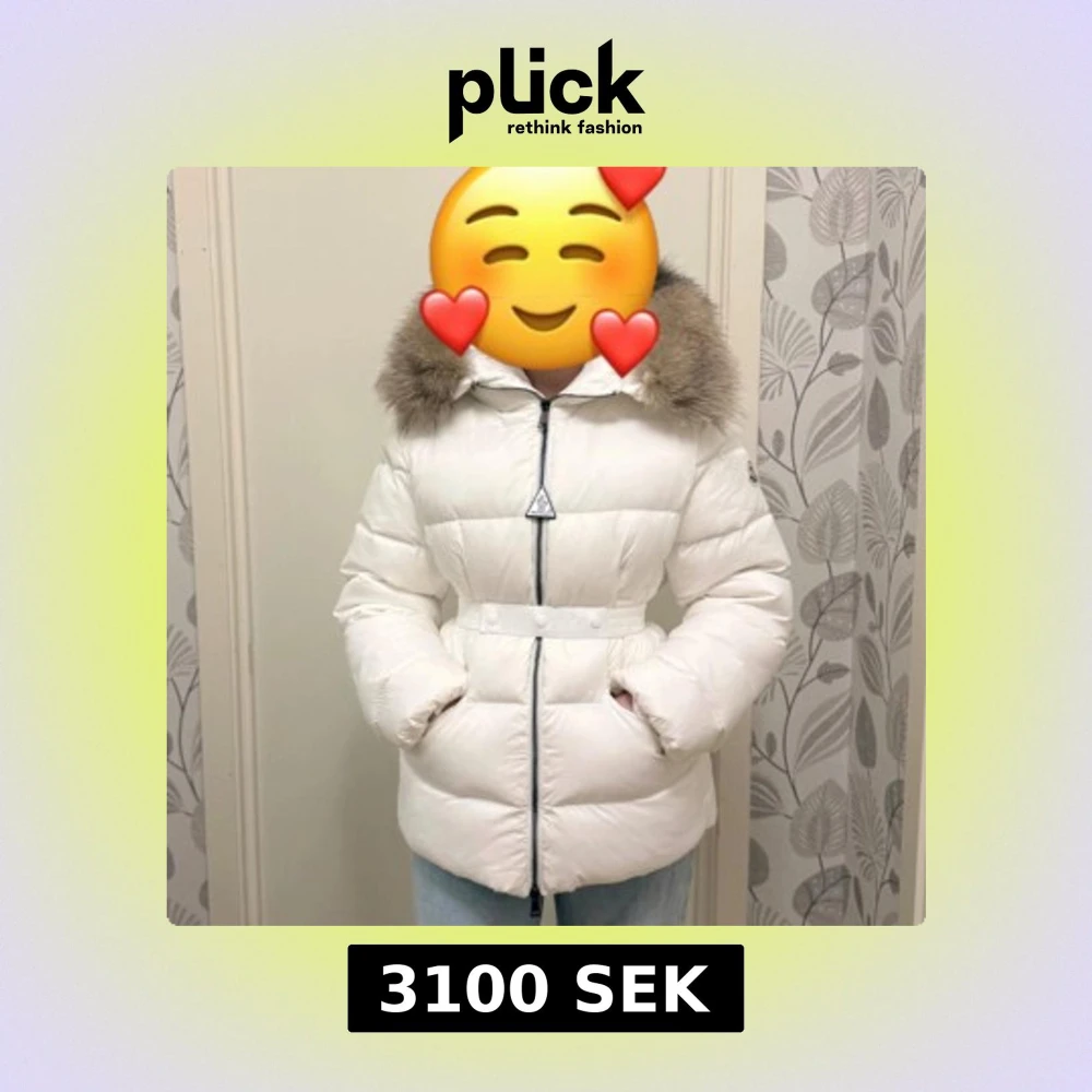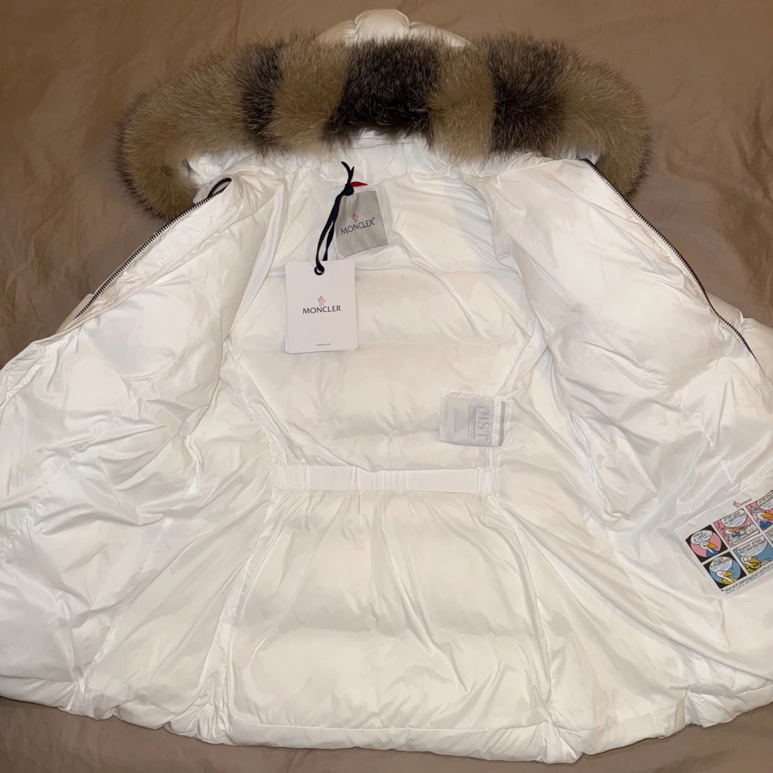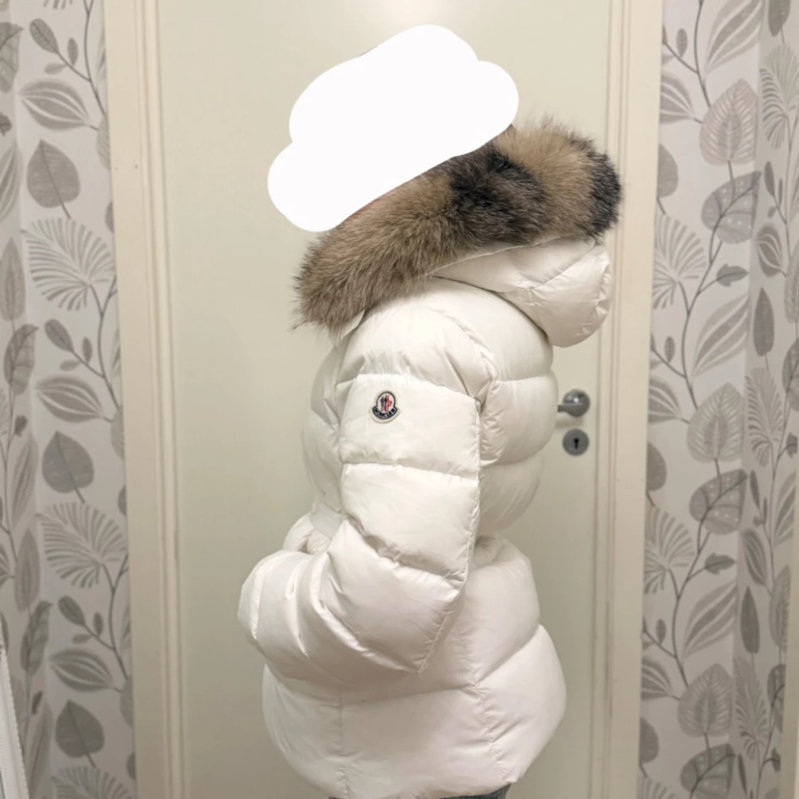 Säljer en snygg vit Moncler dunjacka med fluffig äkta päls. Jackan har avtagbar bälte i midjan, dragkedja framtill och Moncler-logga på ärmen. Perfekt för kalla vinterdagar och har en riktigt lyxig vibe. Jackan är endast testad på!