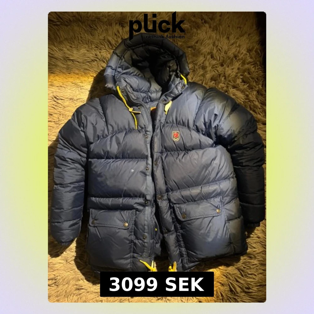 Säljer en mörkblå dunjacka från Fjällräven med gul snörning och huva. Jackan har två stora fickor med knappar, broderad logga på bröstet och dragkedja framtill. Den har en defekt på framsidan som man ser på tredje bilden men de är inget man lägger märke till. Defekter sänker priset något och de är därför den är billigare än alla andra!Perfekt för kalla dagar och har en schysst, puffig look.