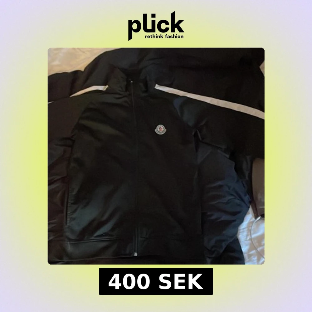 Säljer en svart jacka från Moncler med dragkedja och diskret logga på bröstet. Jackan har en sportig look med lång ärm och stilrena detaljer. Perfekt för dig som gillar klassisk och clean stil.