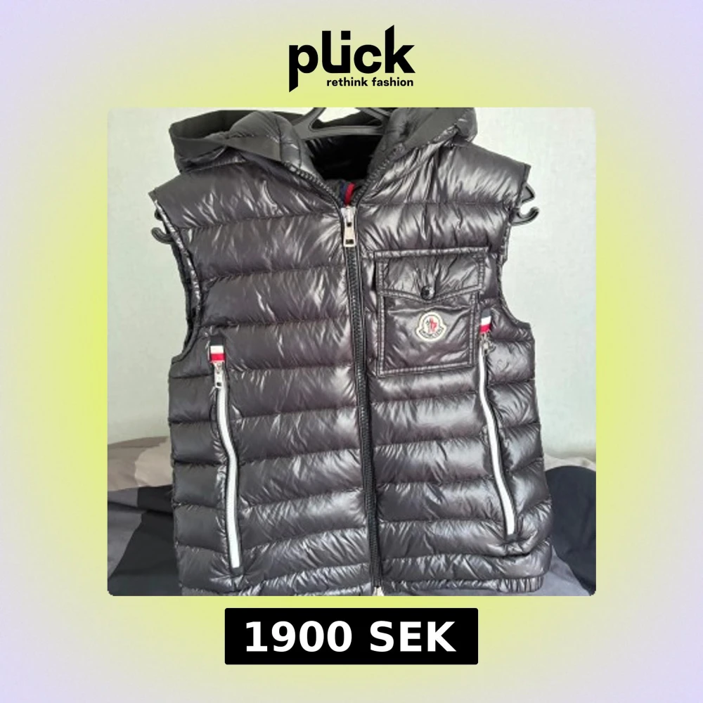 Snygg svart dunväst från Moncler med avtagbar huva och två dragkedjefickor framtill. Västen har quiltad design, bröstficka med logotyp och vita detaljer vid dragkedjorna. Perfekt för sommaren☀️