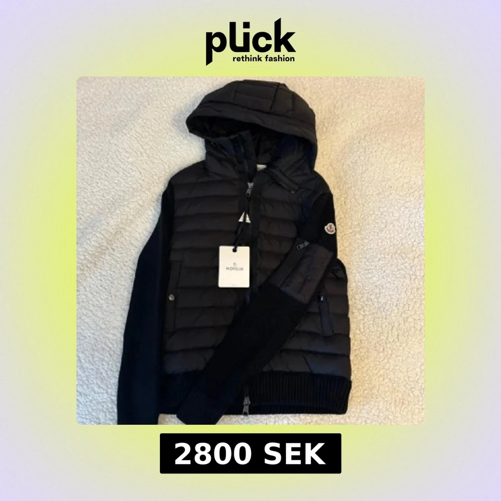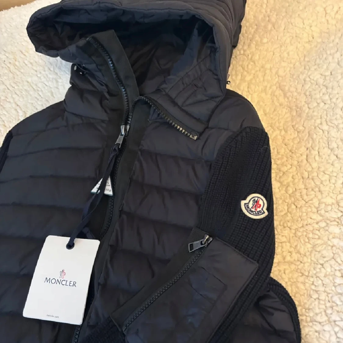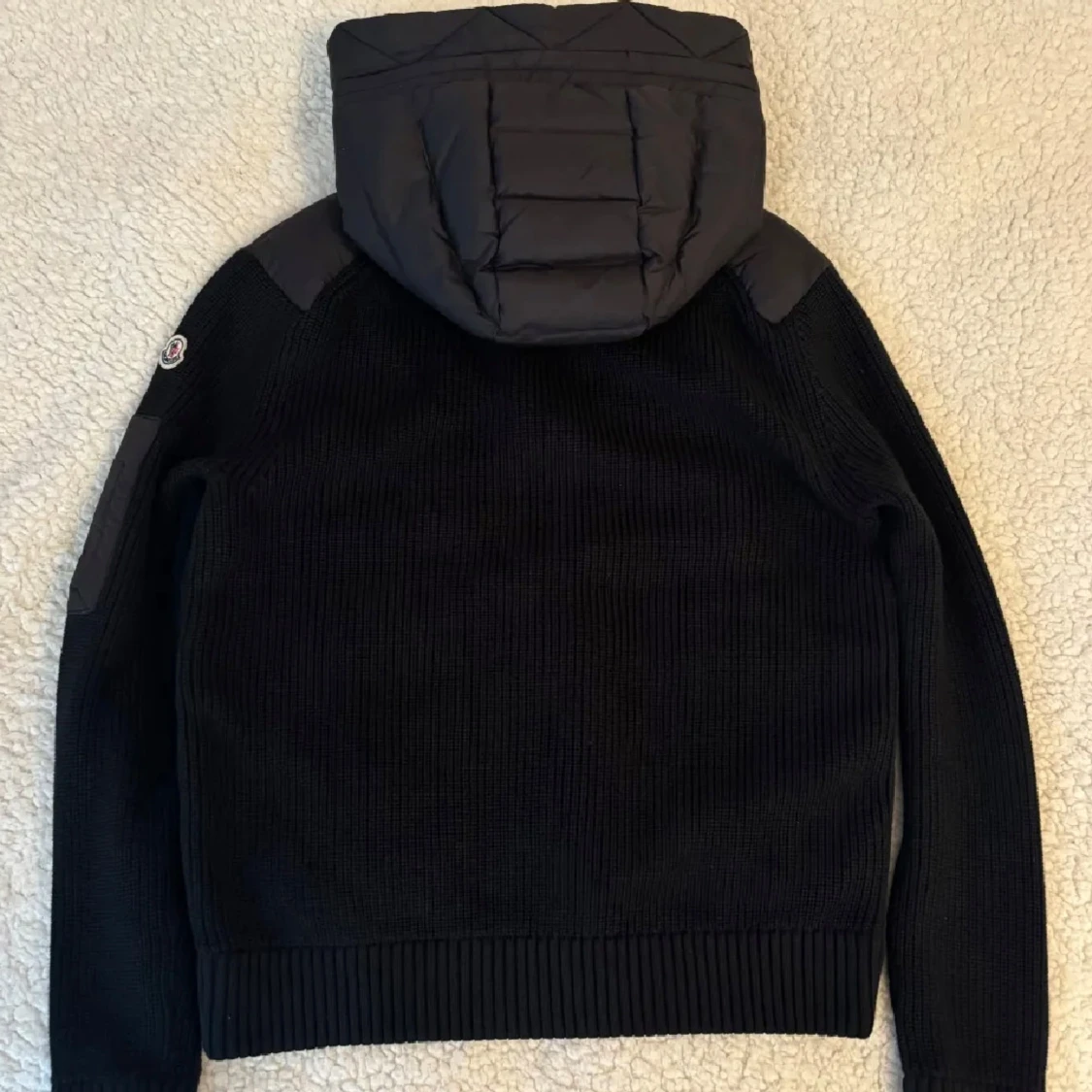 Svart zip-up hoodie i äkta Moncler-kvalitet. Mjuk stickad känsla, lätt vadderade detaljer och huva – perfekt för både vardag och mer dressad stil. Ikoniska loggan på ärmen ger en tydlig men clean look. Aldrig använd – nypris runt 6 000 kr. Du får den helt ny, till ett mycket bättre pris. Bara en tillgänglig – först till kvarn.