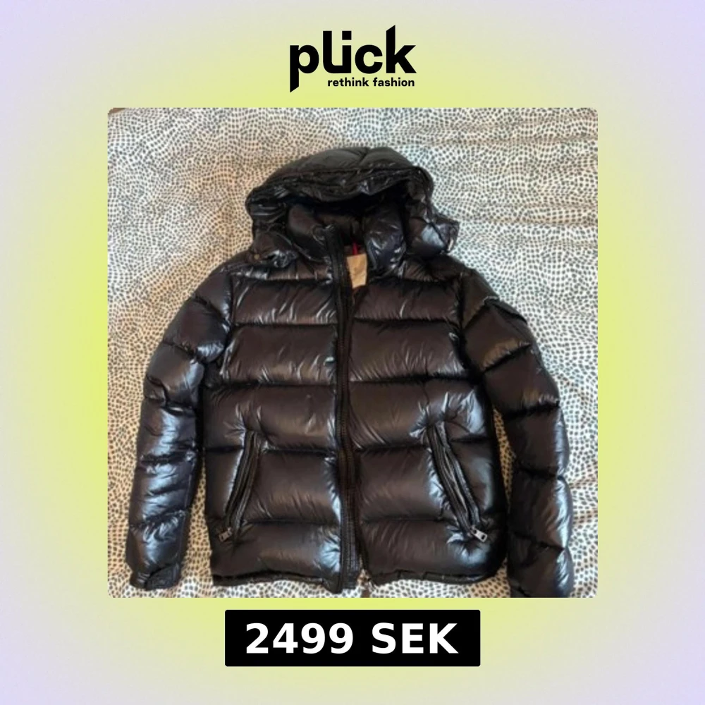 Säljer en svart, glansig dunjacka från Moncler med huva och dragkedja framtill. Jackan har två snedställda fickor med dragkedja och klassisk Moncler-logga på ärmen. Perfekt för kalla dagar och riktigt snygg streetstil.