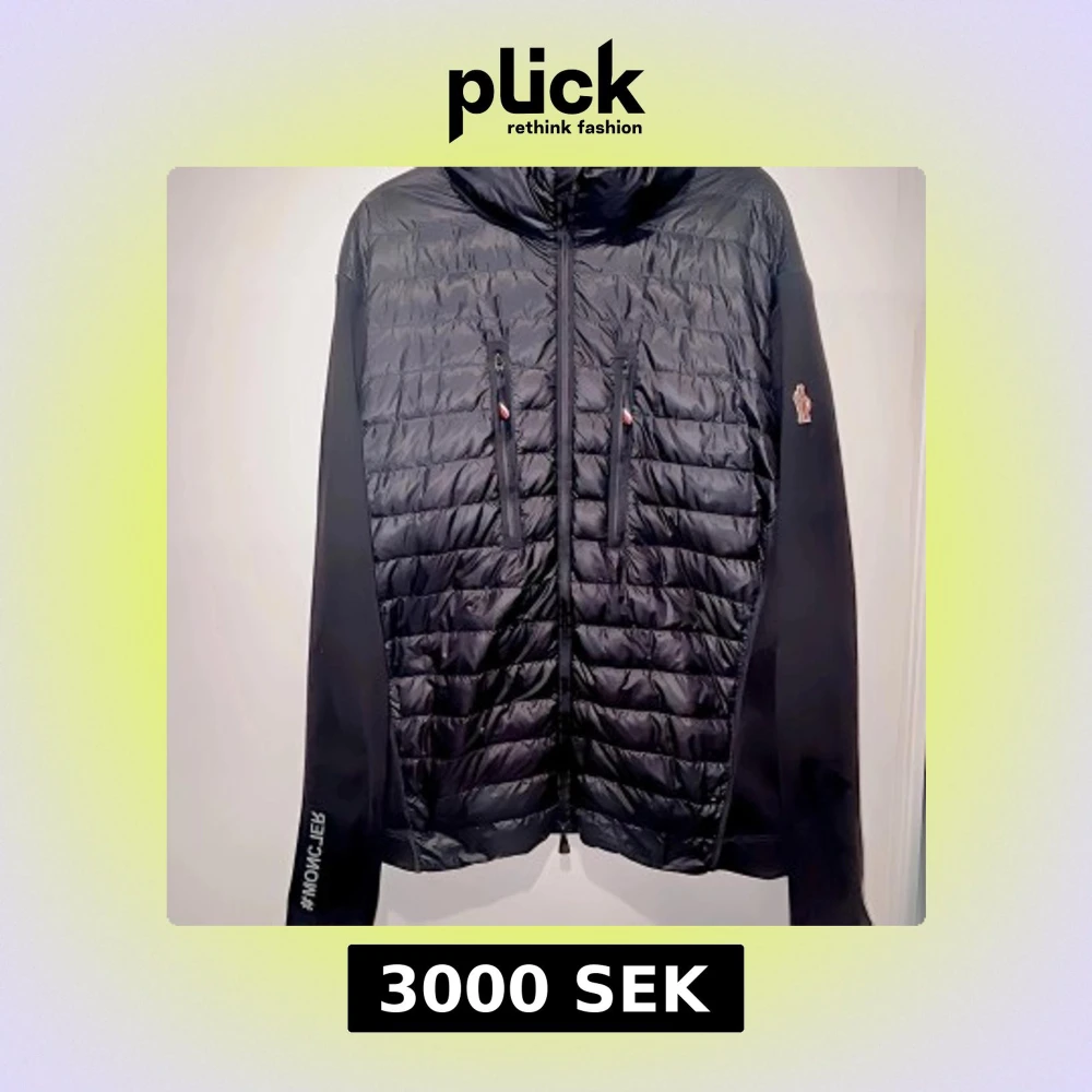 Moncler jacka med vadderad polyester som håller värmen när det blir kyligare & ribbstickade partier i jungfru-ull. Storlek XL, men tack vare det stretchiga materialet passar den allt från M till XL beroende på önskad passform..